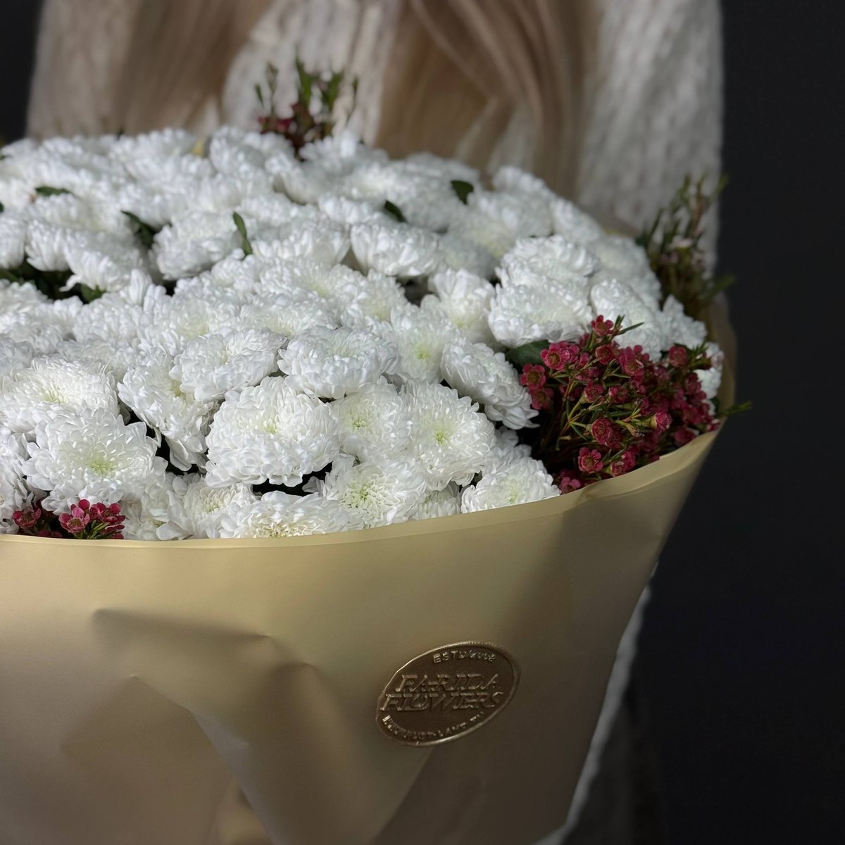 Мы добавили шамилацум — лёгкие акценты, которые подчёркивают объём и делают букет ещё более фактурным и богатым. Вживую он еще больше впечатляет масштабом.
