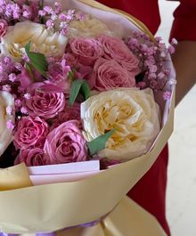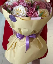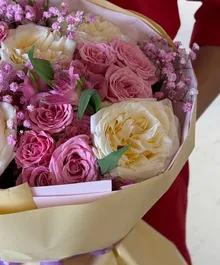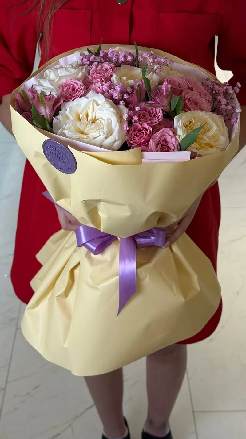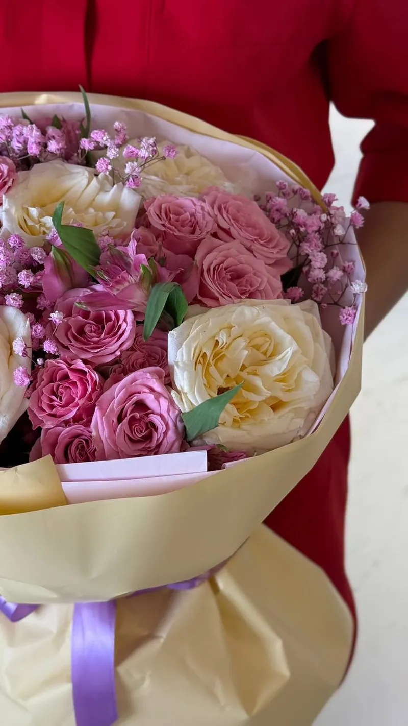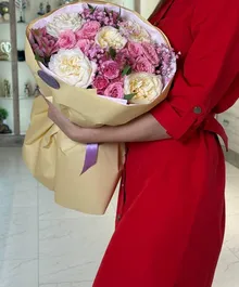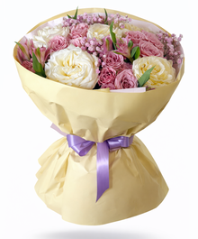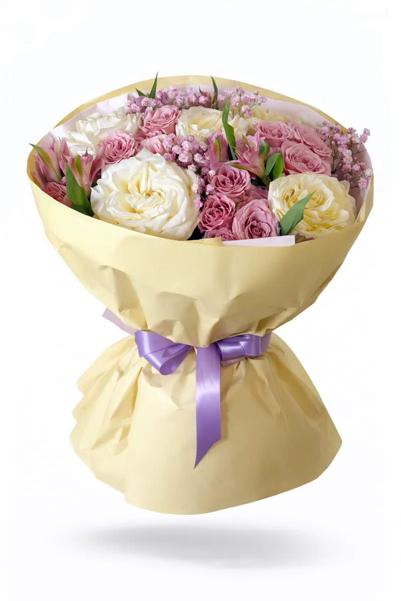 Изысканная композиция в кремово-розовой палитре: пышные белые и сливочные розы в сочетании с нежными кустовыми розами и воздушной гипсофилой создают объём и глубину. Мягкая пастельная упаковка с лавандовым акцентом подчёркивает утончённость и добавляет ощущение лёгкой французской эстетики.