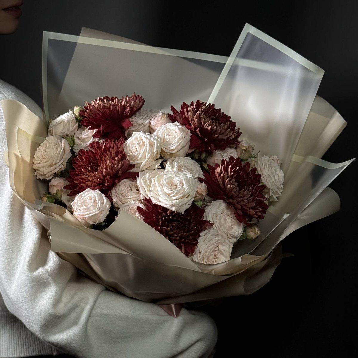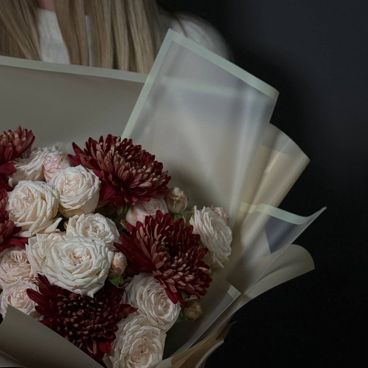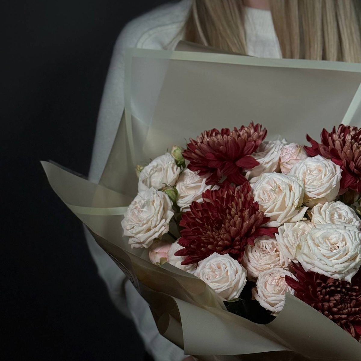 Нежные кремовые розы и глубокие бордовые хризантемы создают букет с характером.