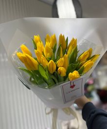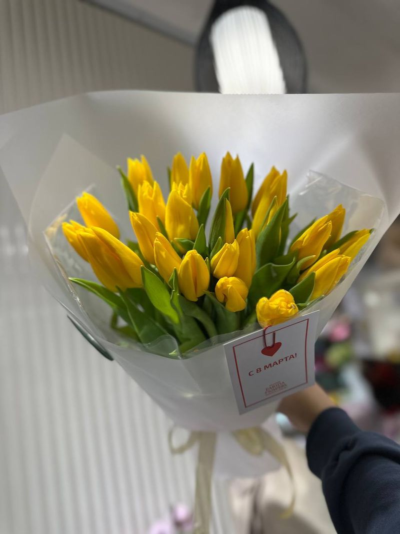 Этот букет — воплощение солнечного настроения и весеннего тепла. Нежные желтые тюльпаны символизируют радость, счастье и заботу, а мягкое свечение гирлянды делает композицию по-настоящему волшебной.