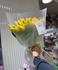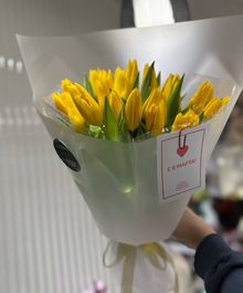Этот букет — воплощение солнечного настроения и весеннего тепла. Нежные желтые тюльпаны символизируют радость, счастье и заботу, а мягкое свечение гирлянды делает композицию по-настоящему волшебной.