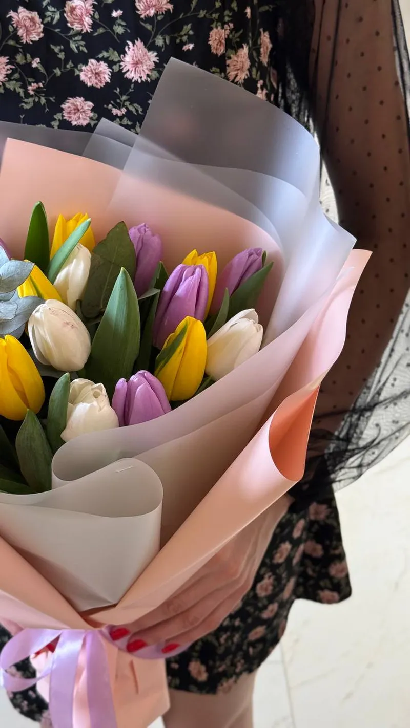 Нежный и свежий букет из ярких тюльпанов в пастельной упаковке создаёт ощущение лёгкости и весеннего настроения. Идеальный вариант для поздравления, комплимента или приятного сюрприза.