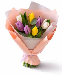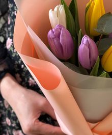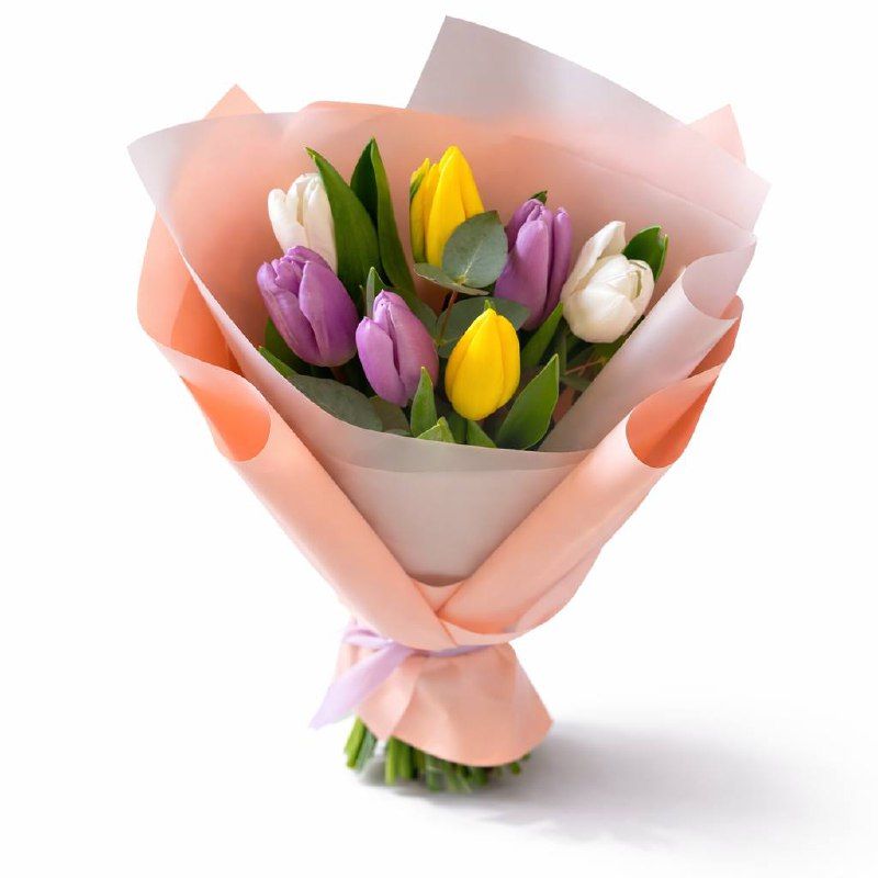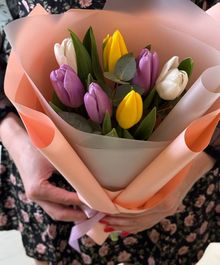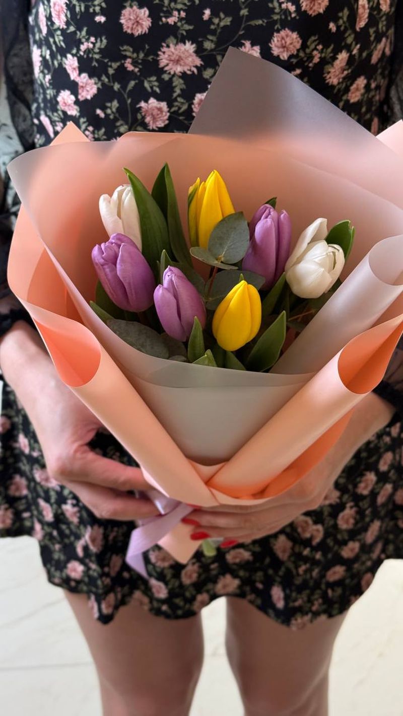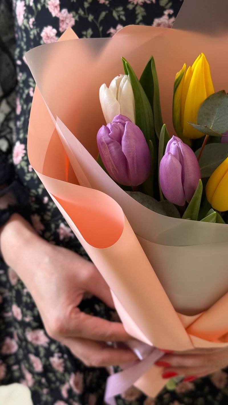 Нежный и свежий букет из ярких тюльпанов в пастельной упаковке создаёт ощущение лёгкости и весеннего настроения. Идеальный вариант для поздравления, комплимента или приятного сюрприза