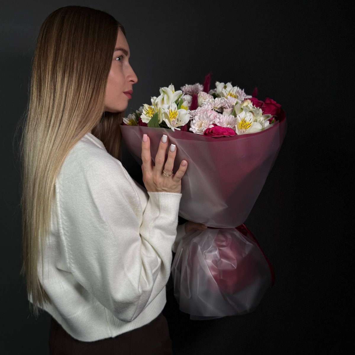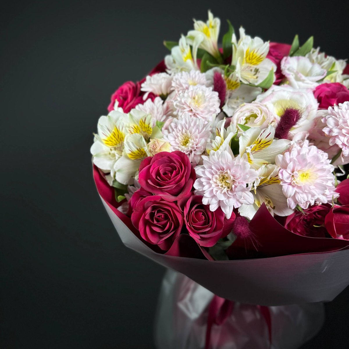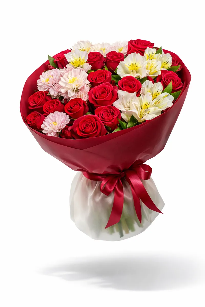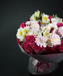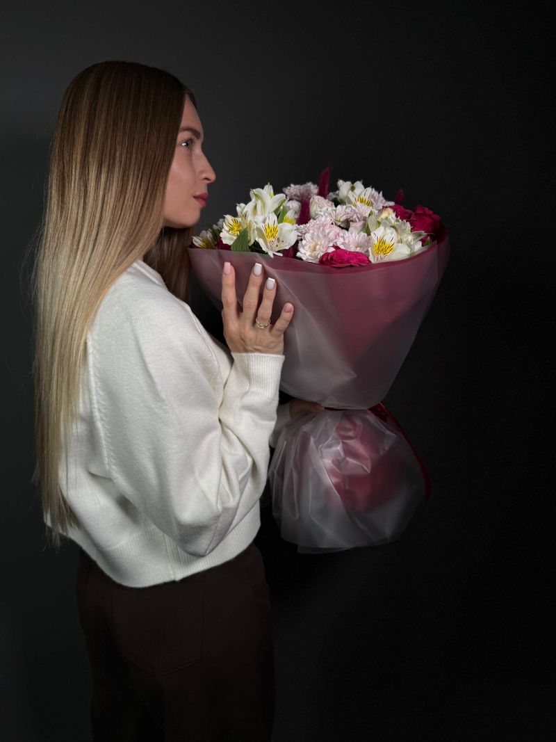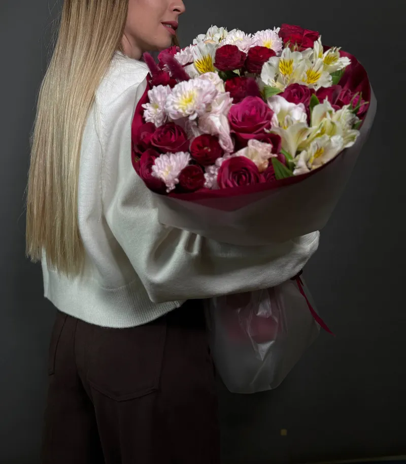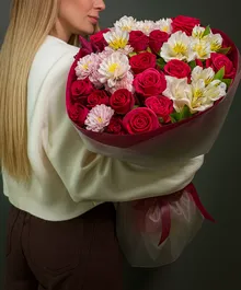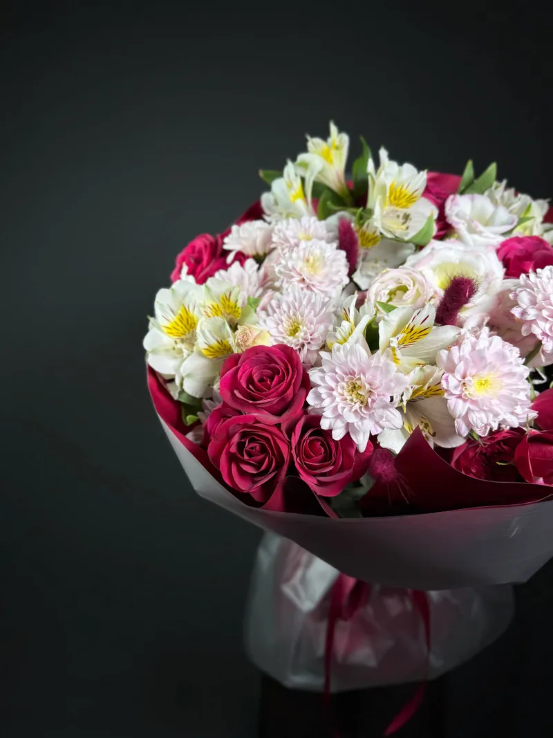 🌸 Состав: розы, альстромерии, хризантемы, декоративная зелень