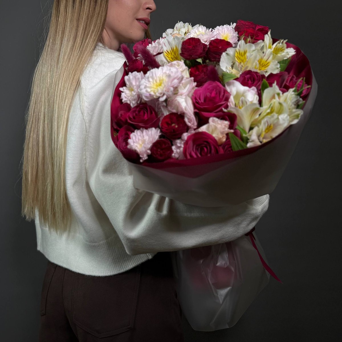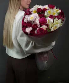 Букет «Вино и сливки» — сочетание страсти и нежности в каждом лепестке. Глубокие винные розы переплетаются с кремовыми и розовыми оттенками, создавая утончённый контраст, от которого невозможно отвести взгляд.