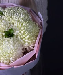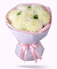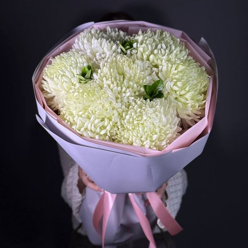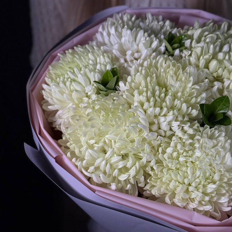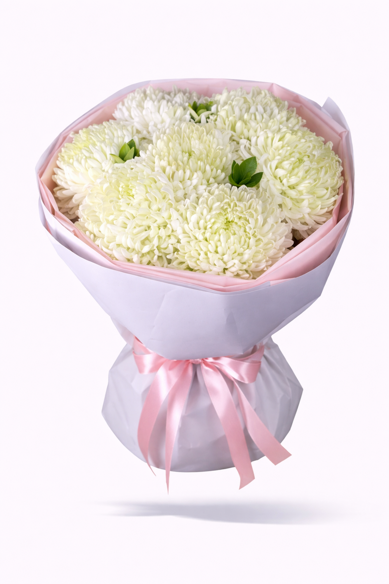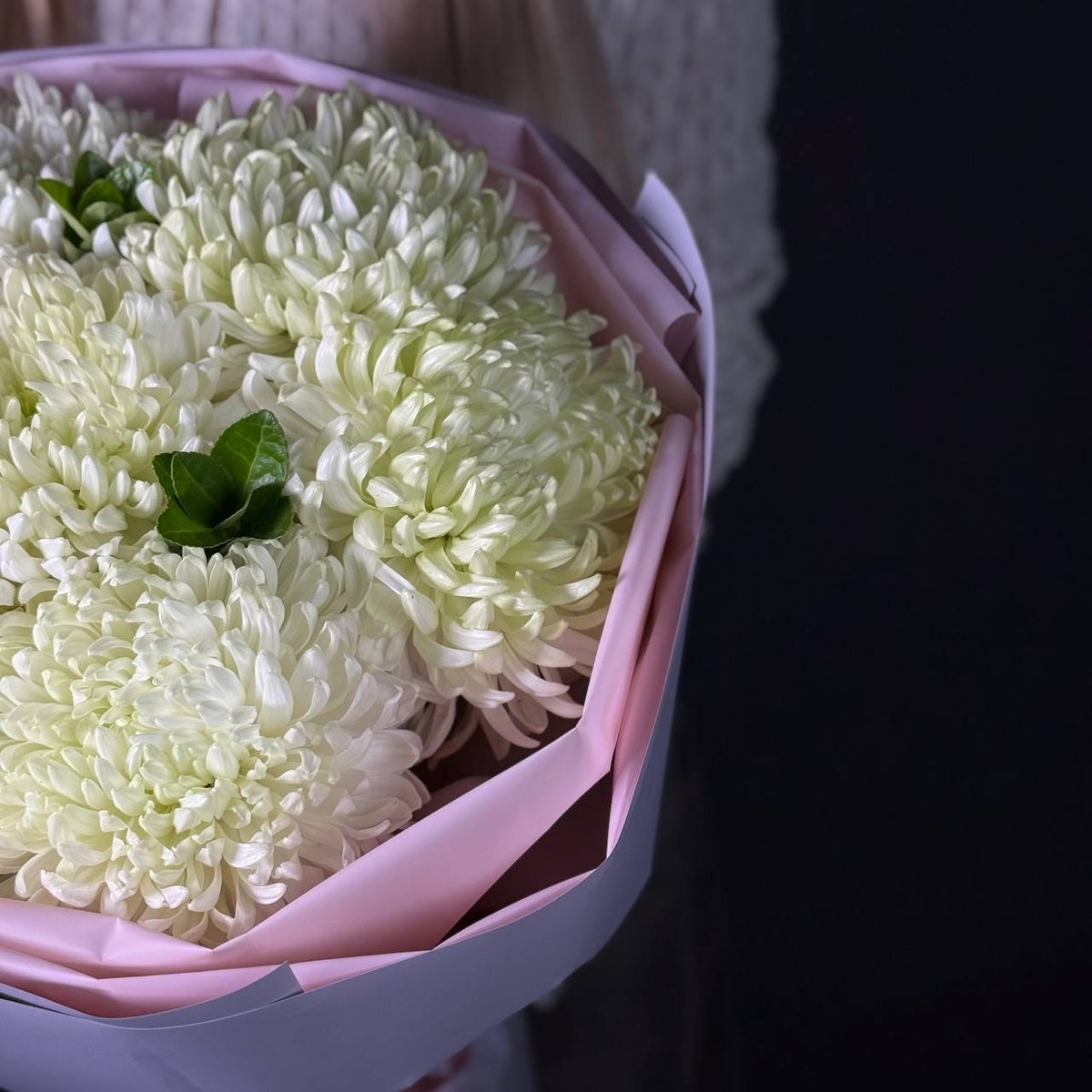 Букет «Запах уюта» — воздушная композиция из крупных бело-кремовых хризантем, сияющих чистотой и спокойствием.