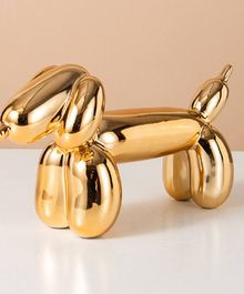 Декоративная статуэтка в форме собаки из воздушных шаров с эффектным зеркальным золотым покрытием. Глянцевая поверхность отражает свет и пространство вокруг, создавая ощущение дорогого арт-объекта из современной галереи.