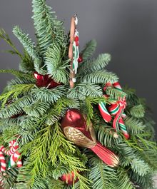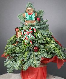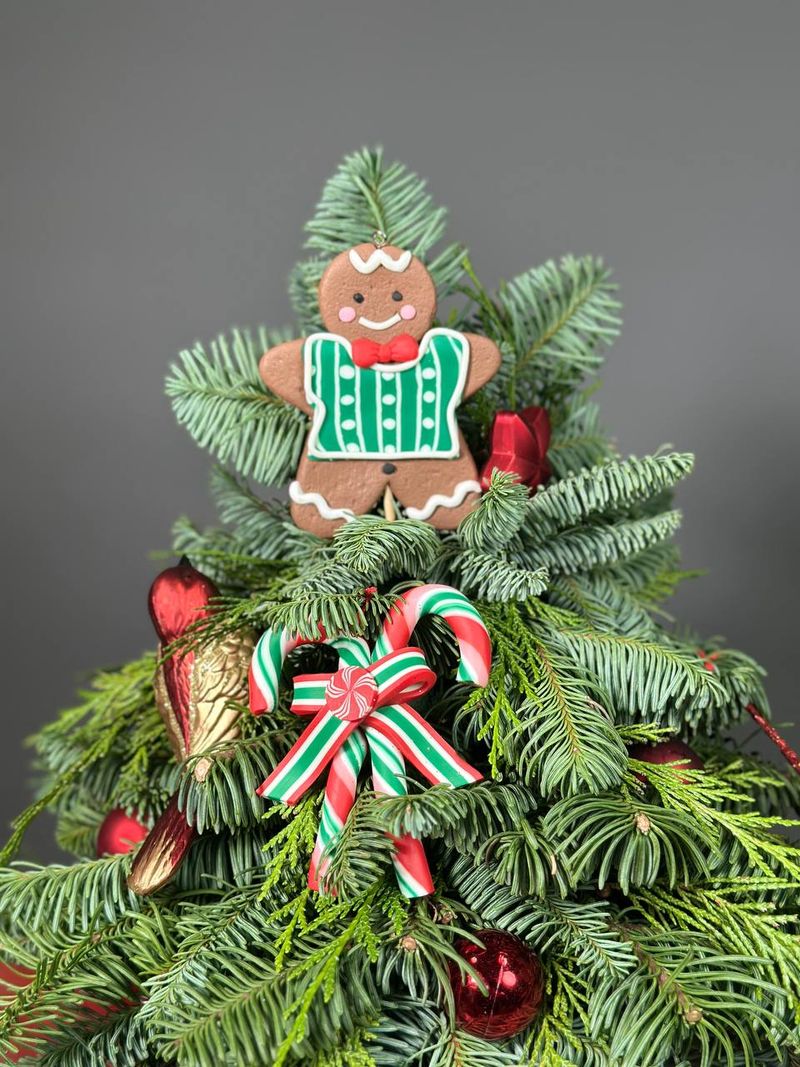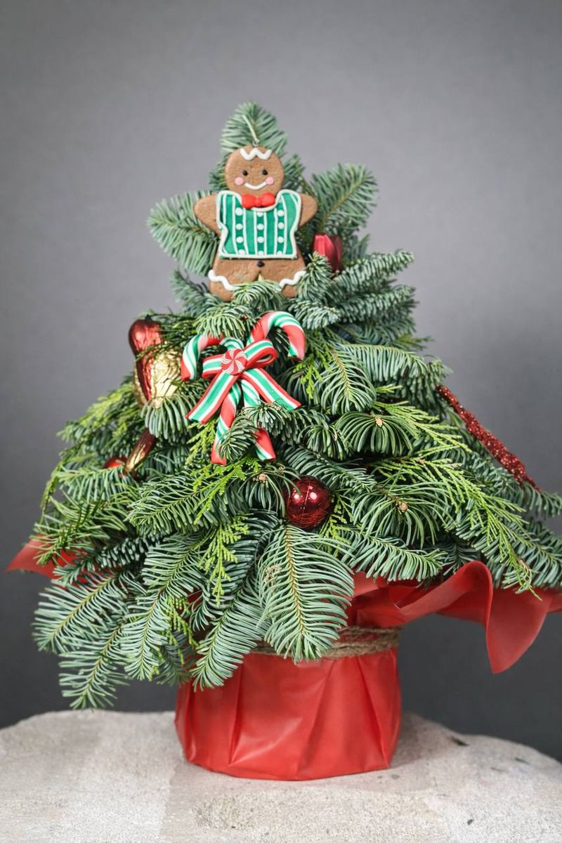 Аромат хвои, тёплый красный декор и пряничный герой наверху. Уютная новогодняя композиция с детским настроением — как праздник, который хочется поставить на стол и не убирать до весны.