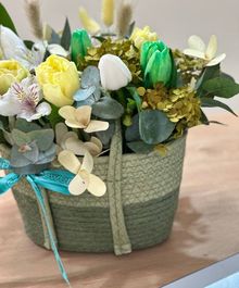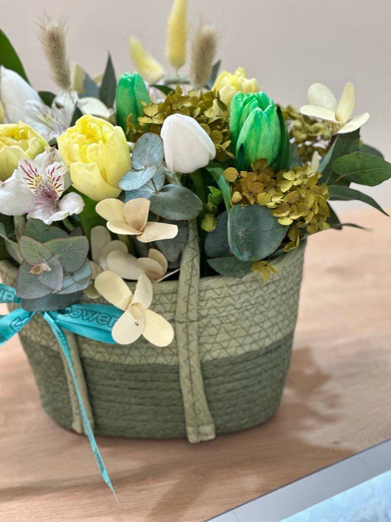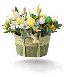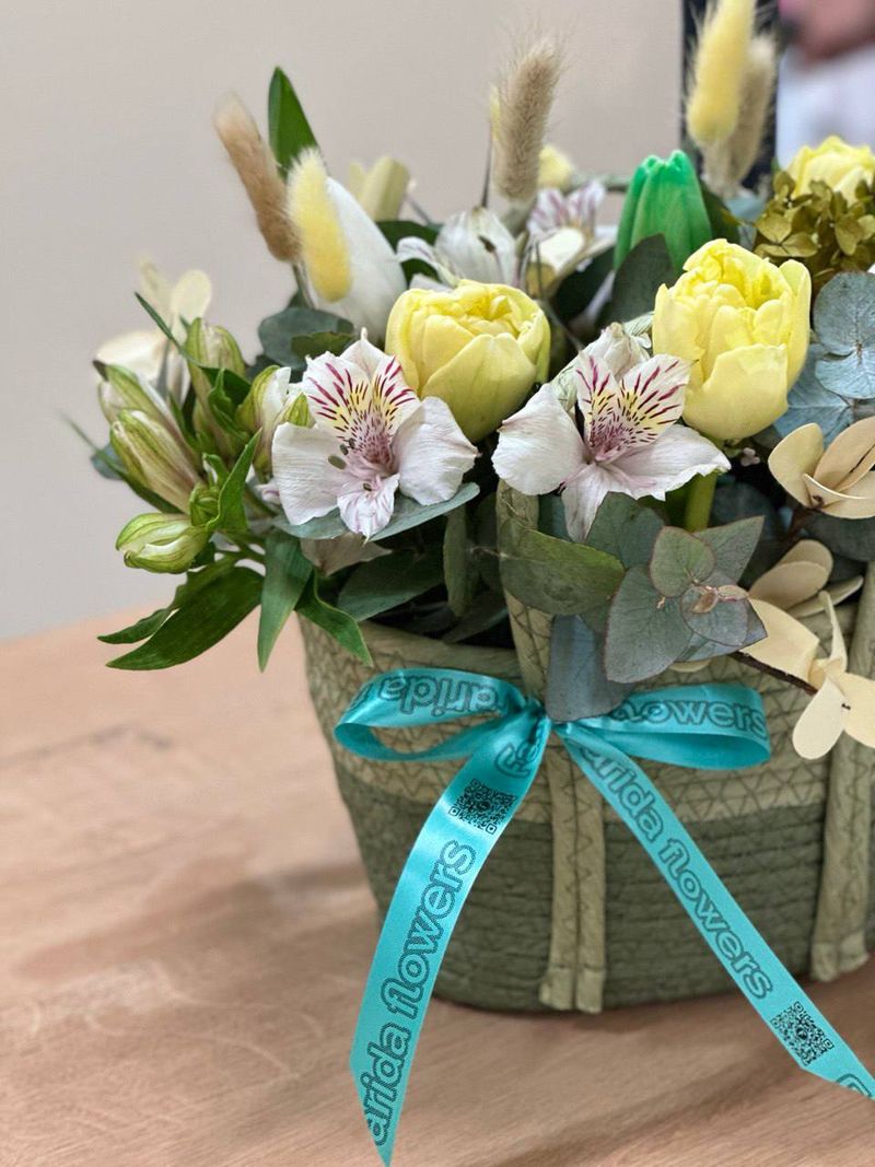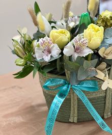 Нежная и свежая композиция в стильной плетёной корзине, которая передаёт атмосферу ранней весны и лёгкого цветочного аромата. Гармоничное сочетание тюльпанов, альстромерии, эвкалипта и декоративной зелени создаёт лёгкий, воздушный образ. Такая композиция станет красивым подарком для любимых, коллег или близких и подарит настоящее весеннее настроение.