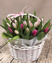 "Все краски цветущей весенней природы собран в корзину. Букет создан из свежих тюльпанов, эти цветы славятся своими нежными оттенками и тонким ароматом весны. Благодаря стойкости, букет продлит праздник на несколько дней. Преподнесите этот букет и порадуйте подарком, в каждом лепестке которого живет весна."