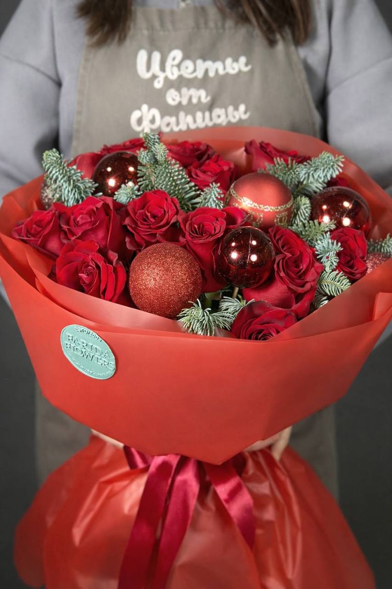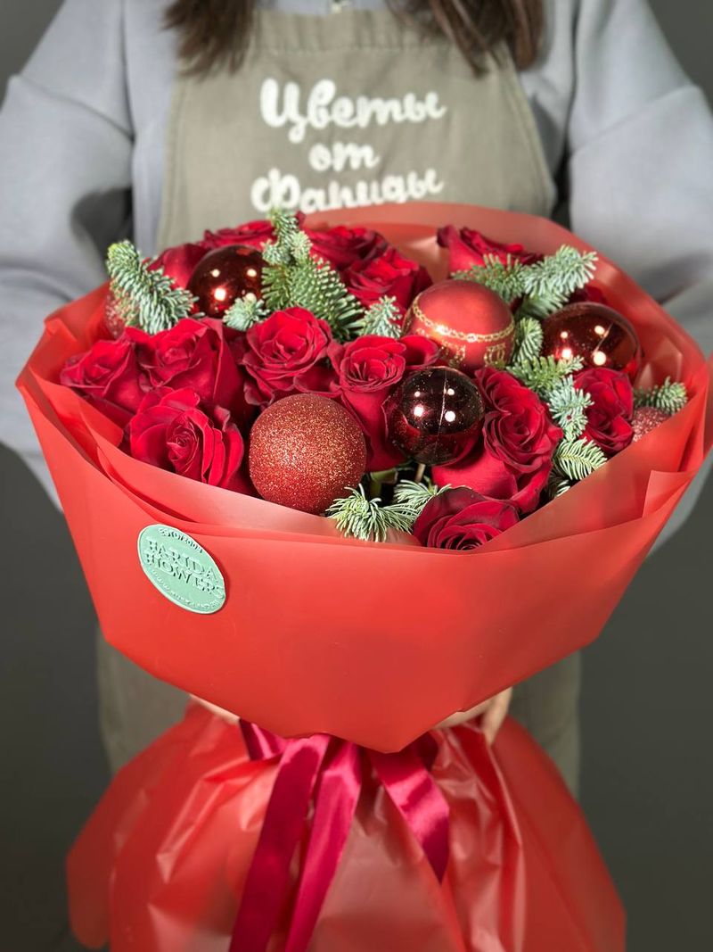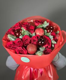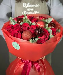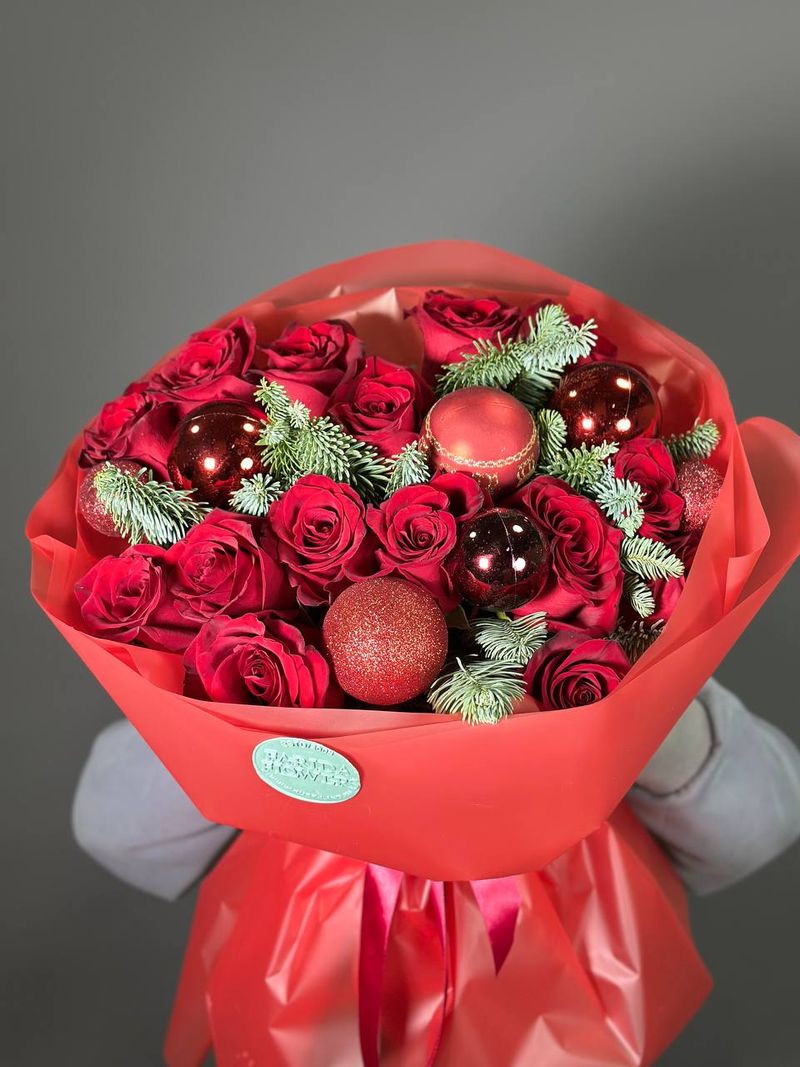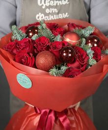 Глубокие алые розы, хвоя и новогодний декор в тёплых оттенках. Яркий, праздничный букет с характером — когда хочется сказать «люблю», «ценю» и «праздник начинается сейчас».
