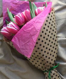 "Все краски цветущей весенней природы собран в букет. Букет создан из свежих тюльпанов, эти цветы славятся своими нежными оттенками и тонким ароматом весны. Благодаря стойкости, букет продлит праздник на несколько дней. Преподнесите этот букет и порадуйте подарком, в каждом лепестке которого живет весна."