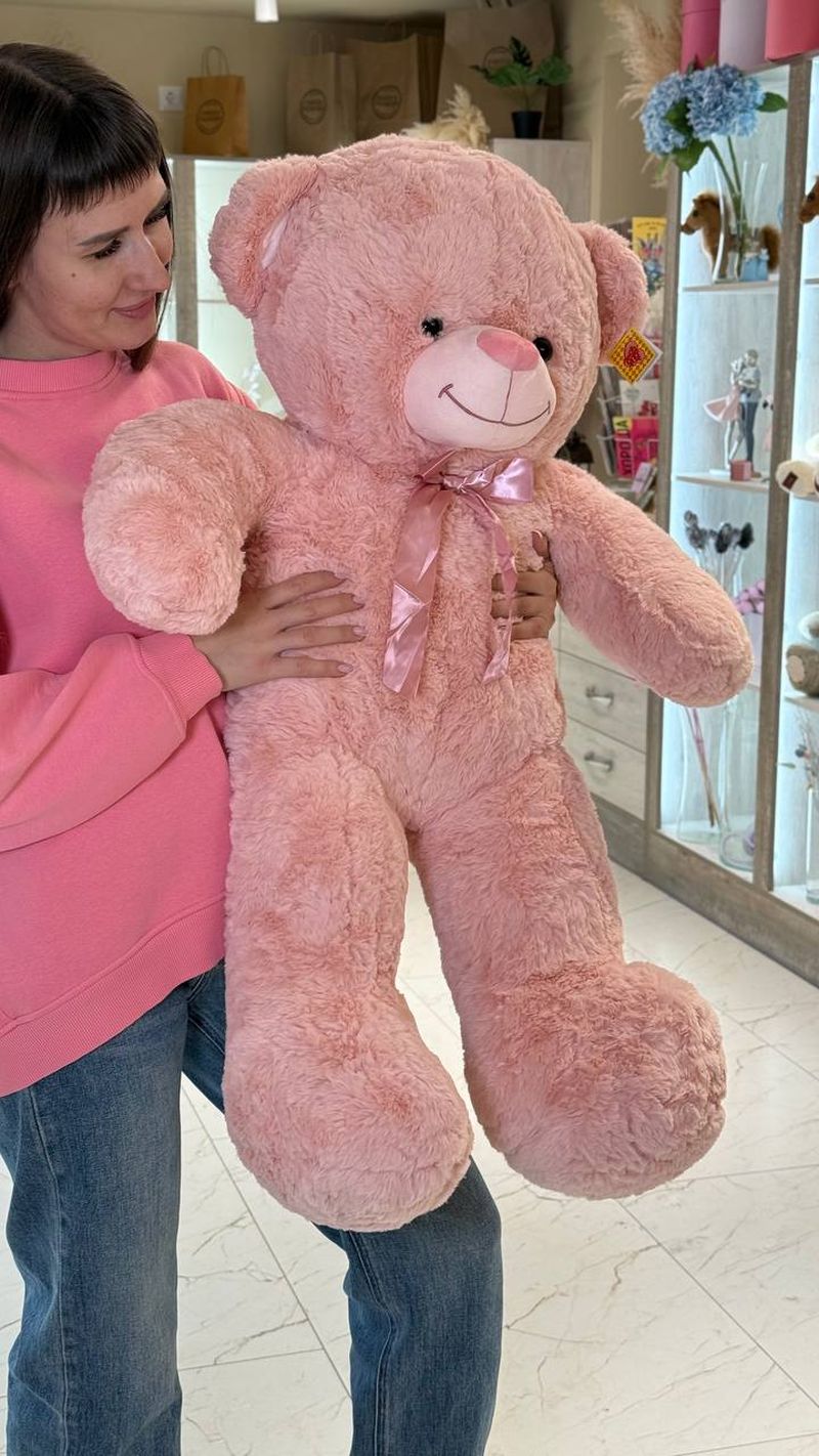 Большой розовый мишка с атласным бантом — подарок, который говорит “люблю” без слов. Невероятно мягкий и уютный, идеально для объятий и эффектных фото. Подходит на 14 февраля, 8 марта, день рождения или просто чтобы устроить сюрприз “вау”.