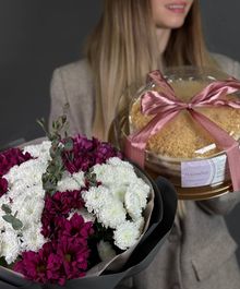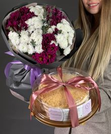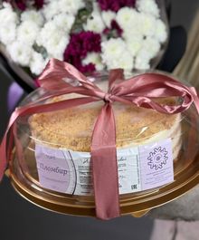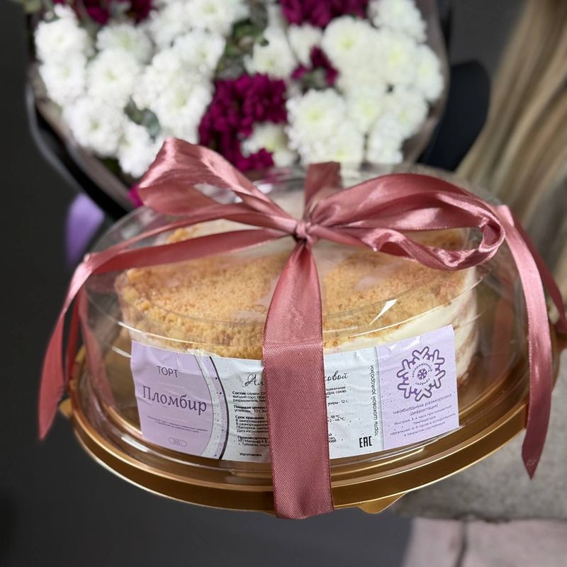 Лёгкий букет создаёт ощущение свежести и праздника, а торт пломбир — это классический вкус, который всегда вызывает тёплые эмоции. Мягкий, воздушный, со сбалансированной сладостью, он становится идеальным дополнением к цветам.