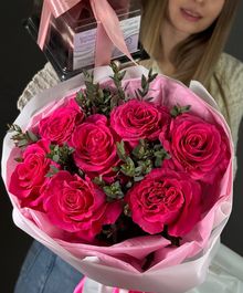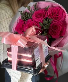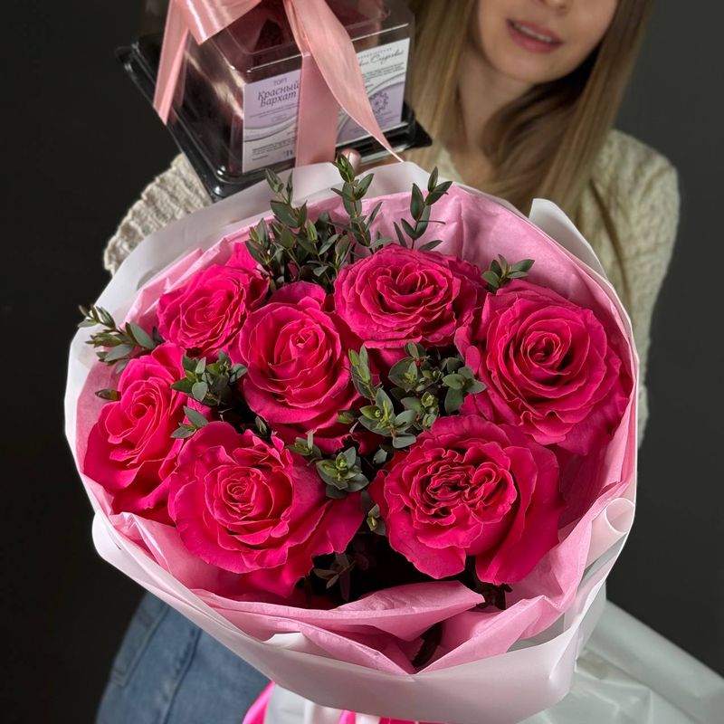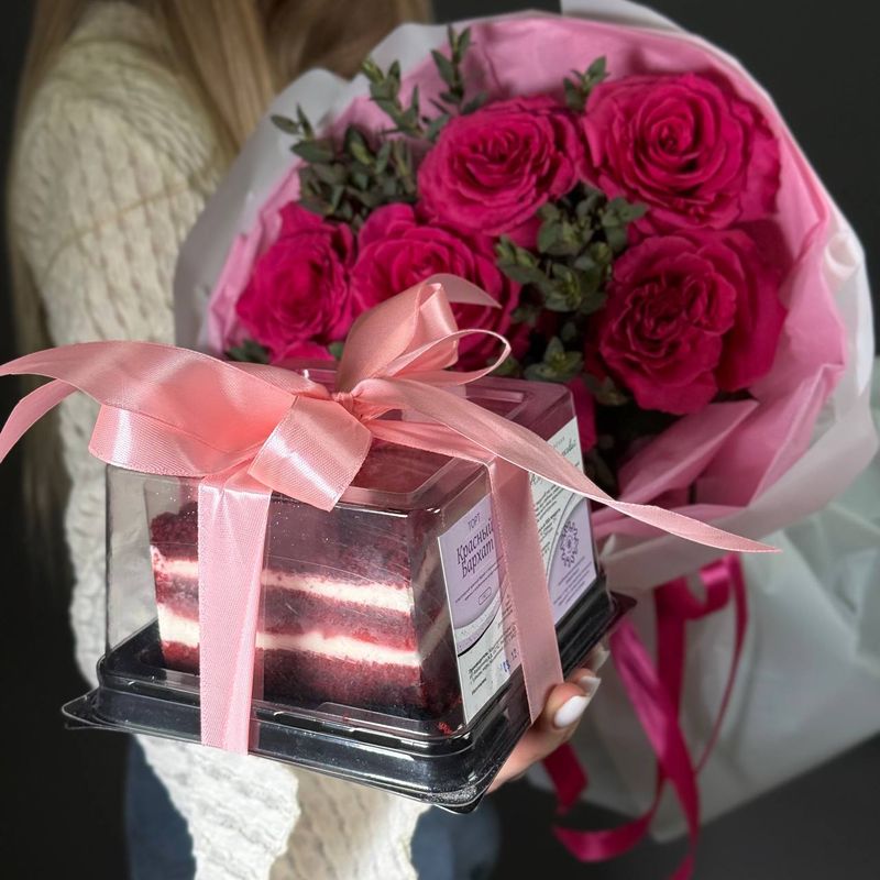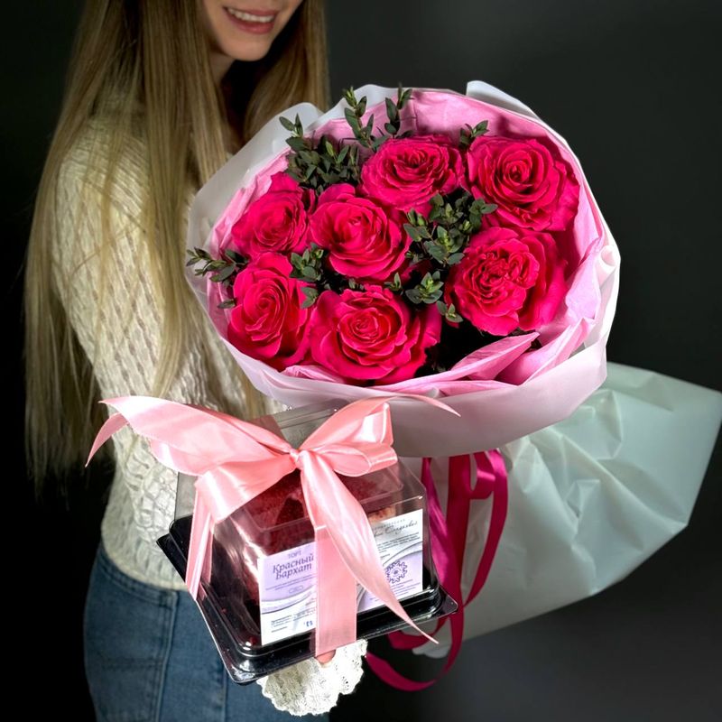 В композицию входят 7 нежных розовых роз с мягким бархатным оттенком в стильной упаковке и фирменный десерт «Красный бархат»