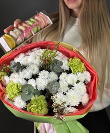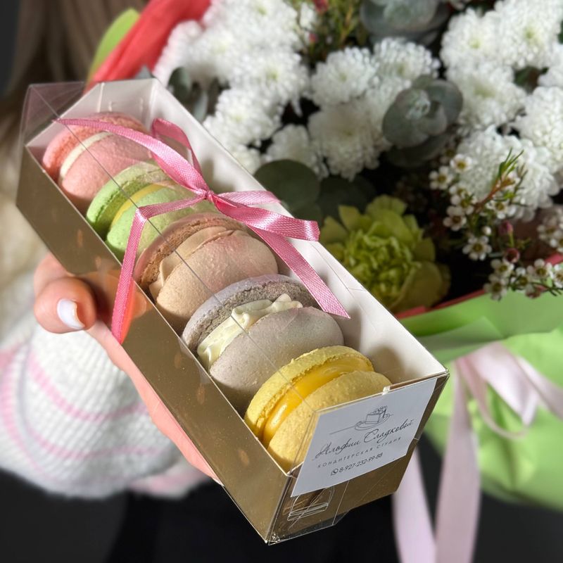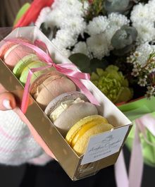 Этот набор — про настроение и заботу. Цветы говорят о чувствах, а макаронс добавляют сладкий момент счастья. Идеальный подарок, когда хочется порадовать красиво и искренне.