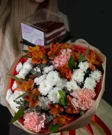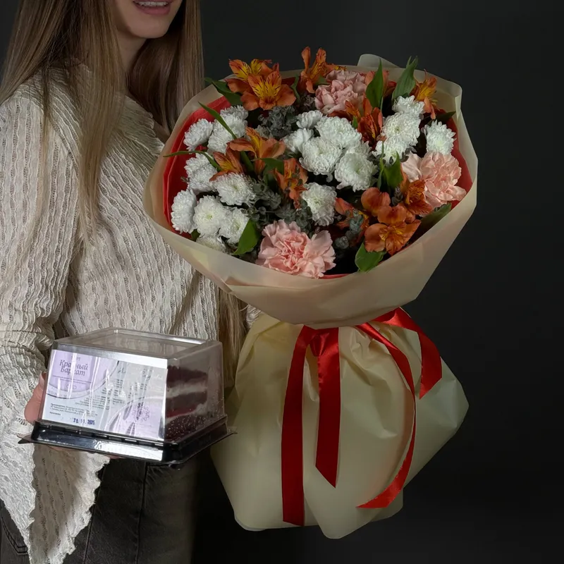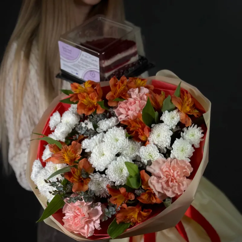 К букету мы добавили мини-десерт «Красный бархат» — очень насыщенный по вкусу. Лёгкий крем, бархатные коржи, нежная сладость — именно тот формат, который приятно съесть за чашкой чая и почувствовать заботу.