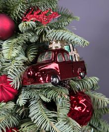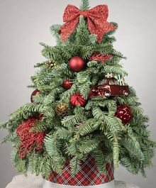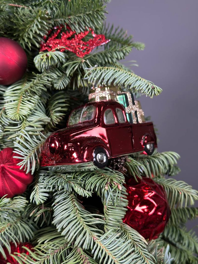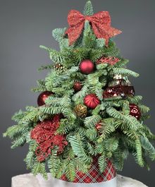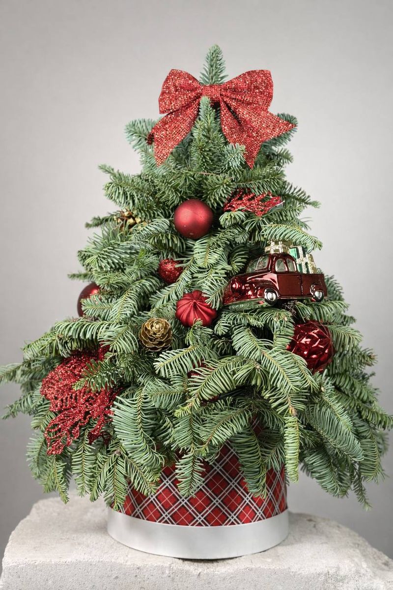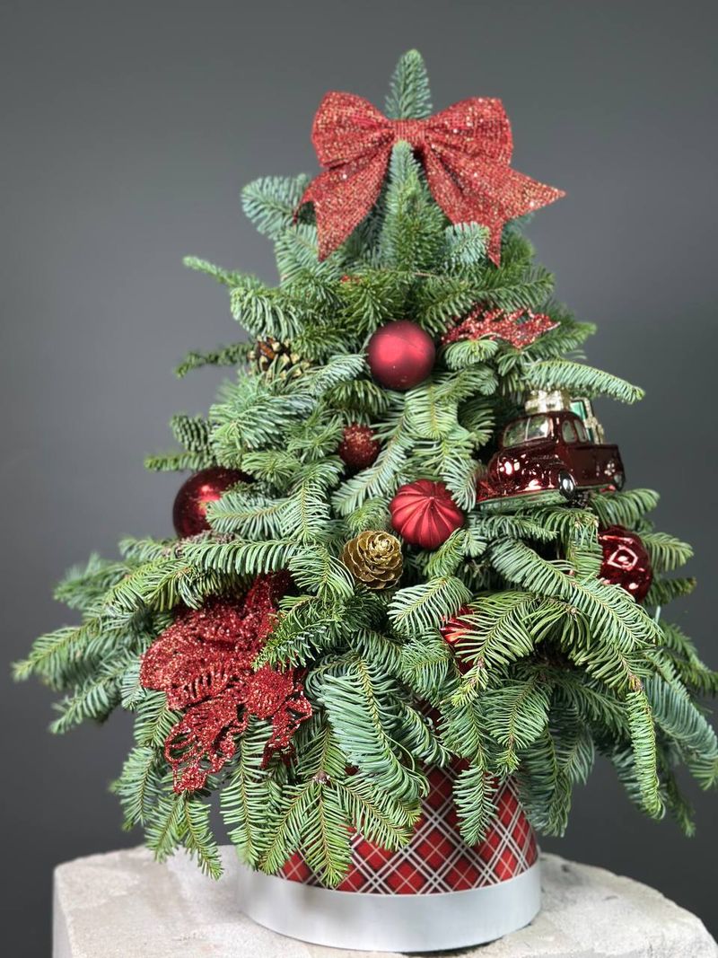 Живая ель с благородным декором в красно-золотых оттенках. Тёплая, уютная композиция с настроением настоящего Рождества — для дома, подарка и праздничного акцента без лишнего шума.