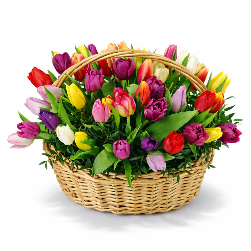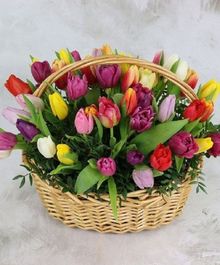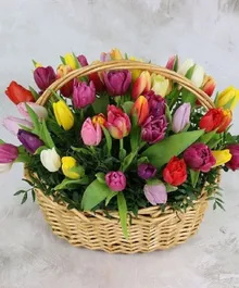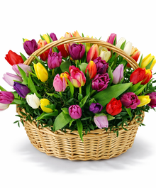 "Все краски цветущей весенней природы собран в этой яркой композиции. Букет создан из свежих тюльпанов, эти цветы славятся своими нежными оттенками и тонким ароматом весны. Благодаря стойкости, букет продлит праздник на несколько дней. Преподнесите этот букет и порадуйте подарком, в каждом лепестке которого живет весна."
