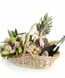 Цветочная композиция из лилии и роз (цвет роз может отличаться), конфеты Ферреро, плитка импортного шоколада, игристое вино Martini Asti в подарок или аналог, ананас, корзина, флористическая губка.
