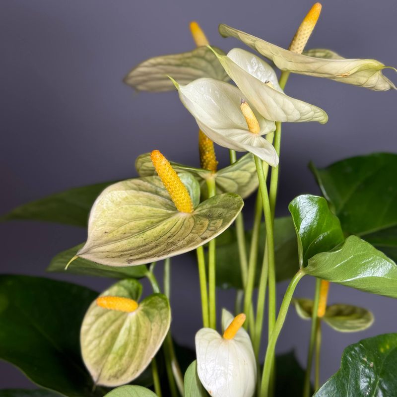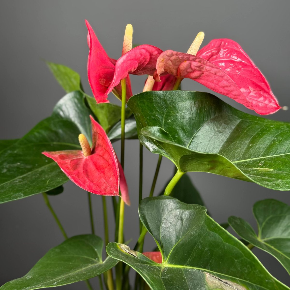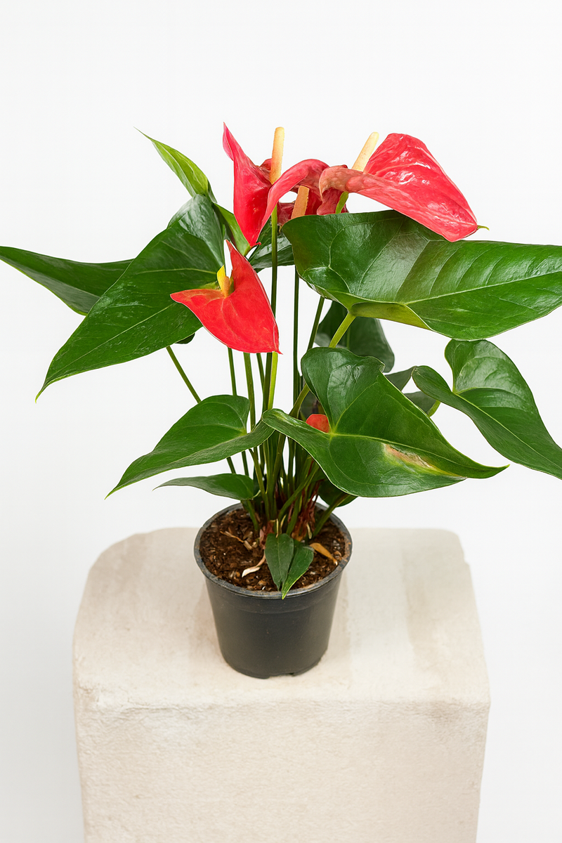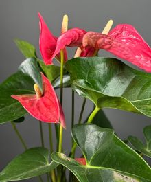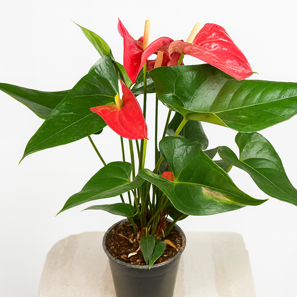 Антуриум — эффектное комнатное растение, которое сразу привлекает внимание яркими «восковыми» цветами и плотной, насыщенно-зелёной листвой. Это растение выбирают, когда хотят добавить интерьеру выразительности и создать ощущение ухоженного, стильного пространства. Антуриум долго цветёт, выглядит дорого и всегда становится акцентом в комнате или офисе.
