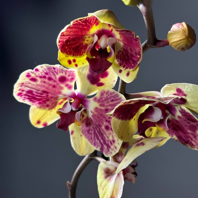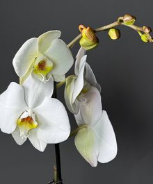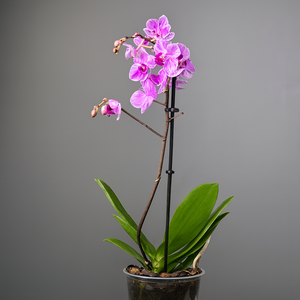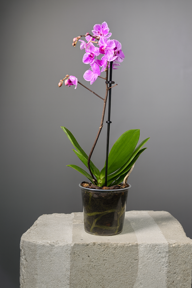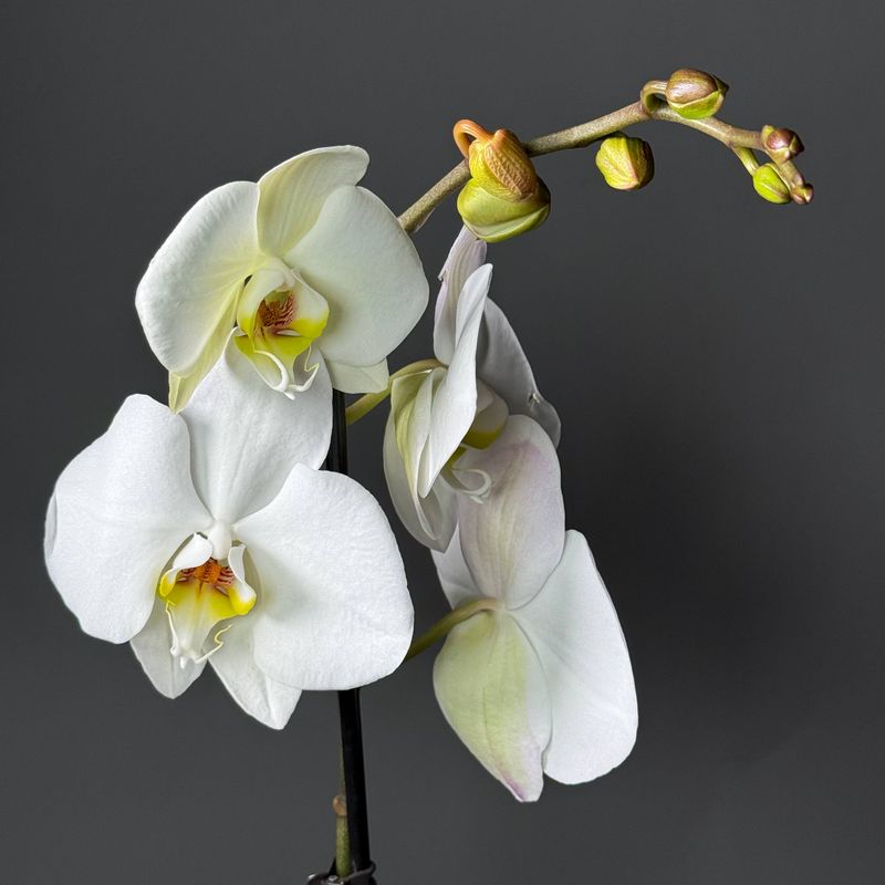 Фаленопсис — самая популярная орхидея, известная своей утончённой формой и длительным цветением. Она выглядит премиально, подходит для любого интерьера и дарит ощущение лёгкости и гармонии. Цветы держатся на ветке неделями, а аккуратная розетка листьев делает растение ещё выразительнее. Отличный вариант для подарка и украшения дома.