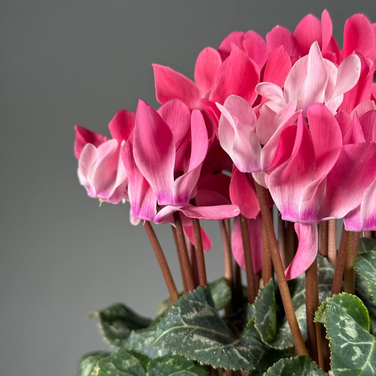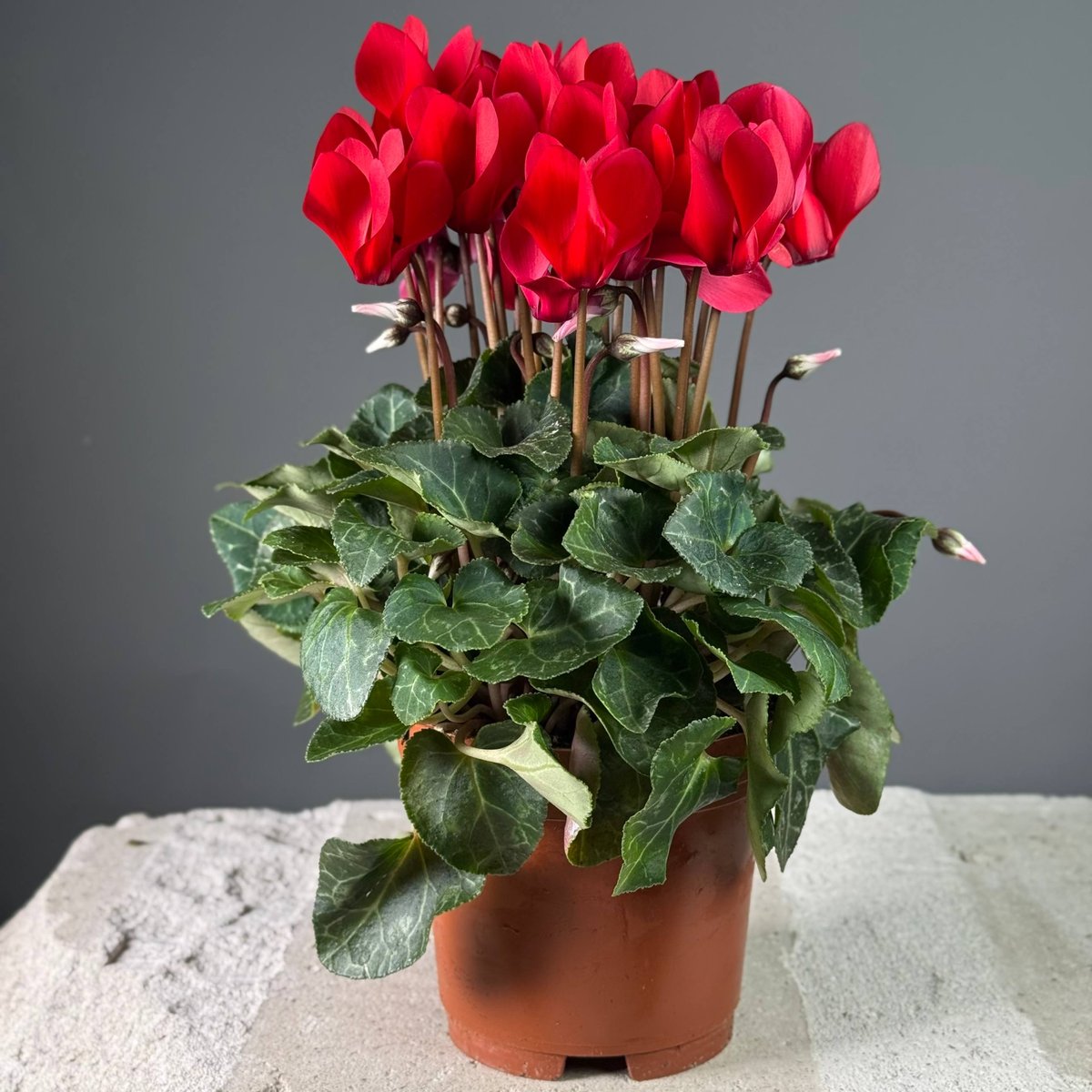 Цикламен — яркое, живое растение с изящными лепестками и крупными декоративными листьями. Цветёт обильно и долго, особенно в холодный сезон, поэтому идеально подходит для создания уюта зимой. Выглядит празднично, свежо и всегда становится акцентом в интерьере или подарке.