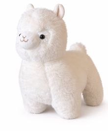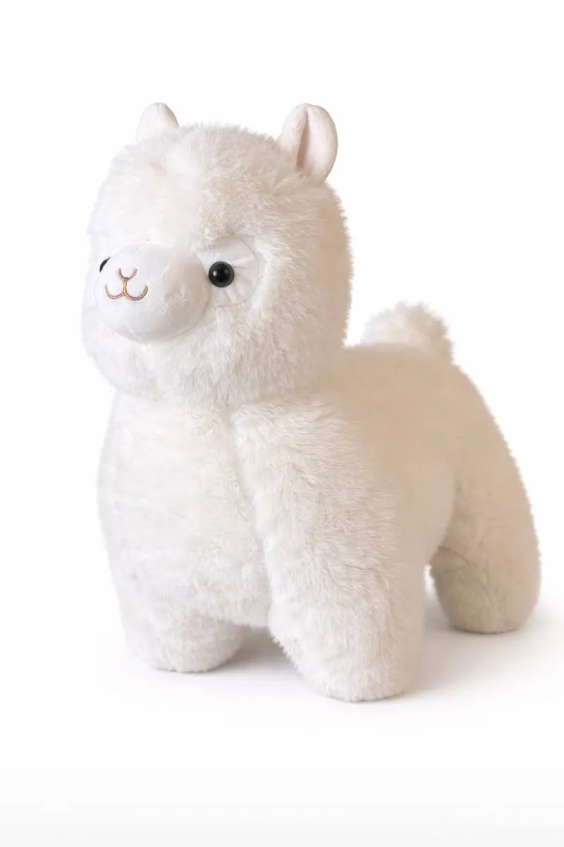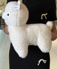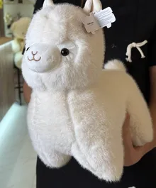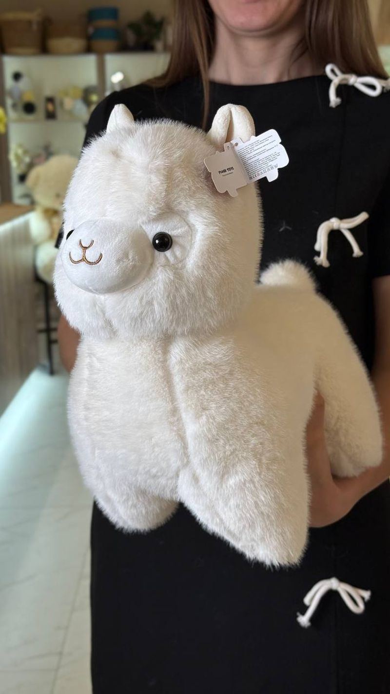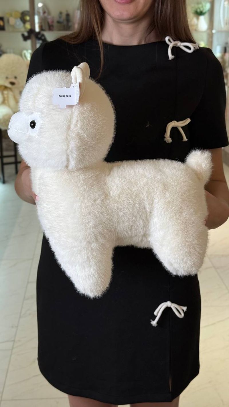 Плюшевая альпака нежного молочного оттенка с густым, мягким и очень пушистым мехом. Игрушка выполнена в стоячем положении, с устойчивыми лапками и аккуратным объёмным силуэтом.