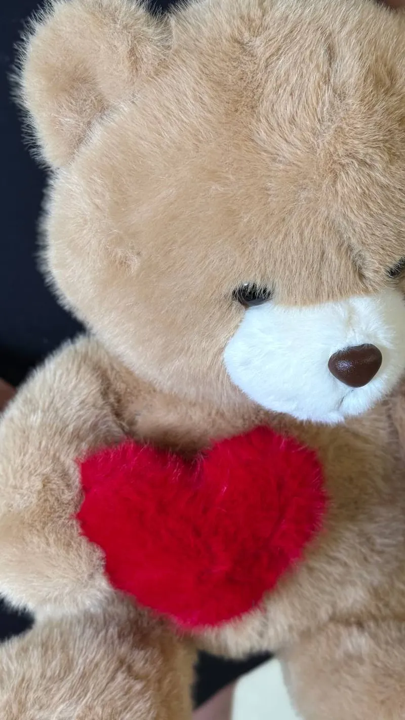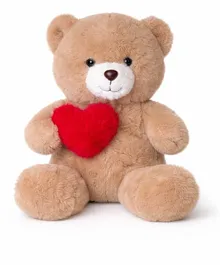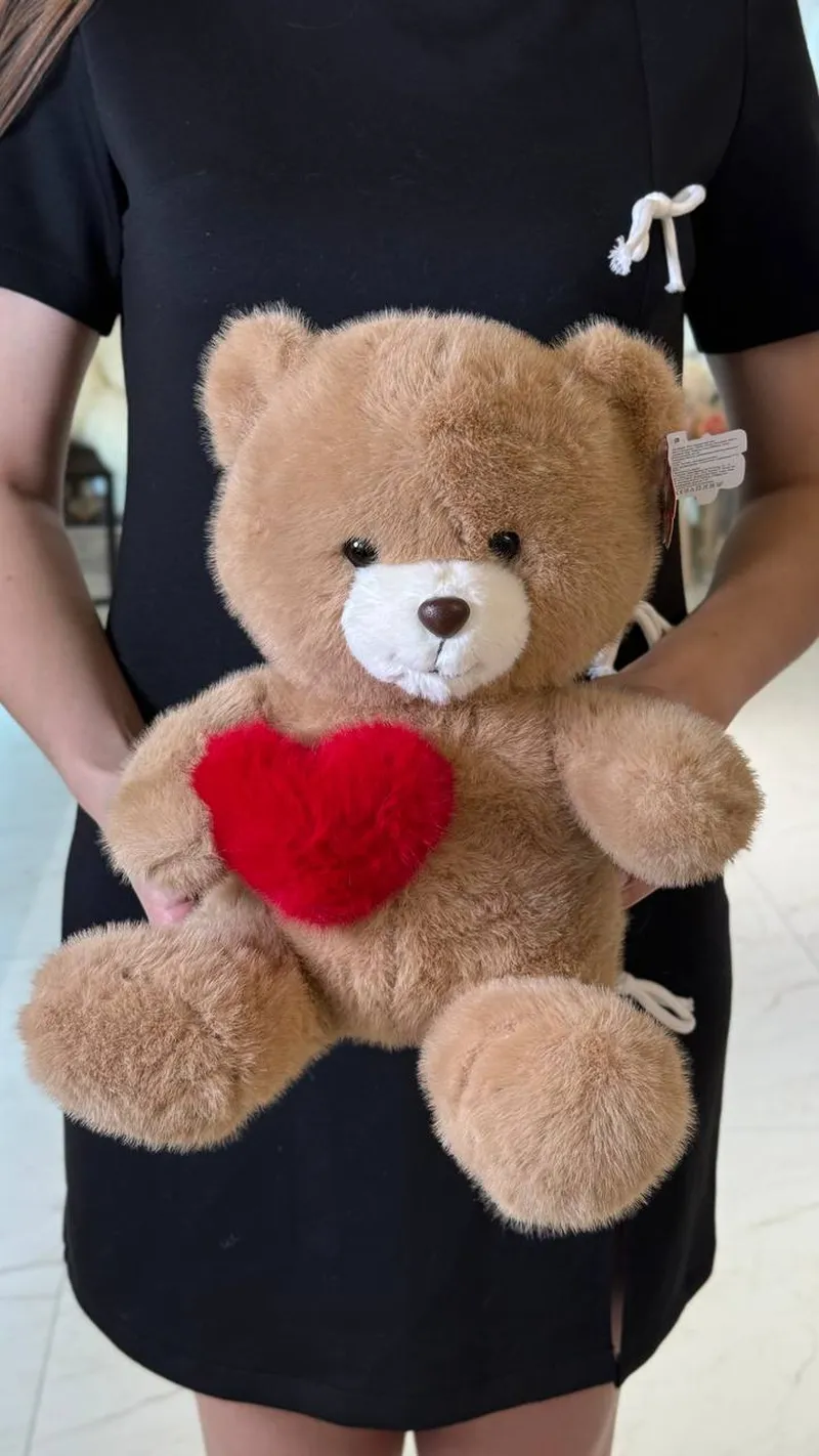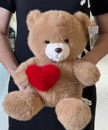 В лапках мишка держит яркое пушистое сердце насыщенного красного цвета — символ любви, заботы и внимания. Контраст мягкого бежевого меха и алого сердца делает игрушку особенно выразительной и праздничной.
