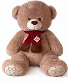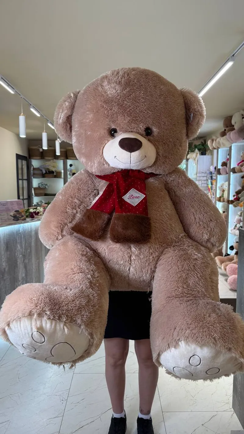 На шее — стильный красный шарфик с декоративной нашивкой «Love» и мягкими коричневыми вставками по краям. Этот акцент добавляет образу романтичности и делает мишку идеальным вариантом для подарка с тёплым посылом.