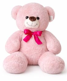 На шее — яркая атласная лента насыщенного малинового цвета, которая добавляет контраста и делает игрушку по-настоящему праздничной. Мишка сидит устойчиво, с объёмными лапками и мягким наполнением — идеально подходит для уютных объятий.