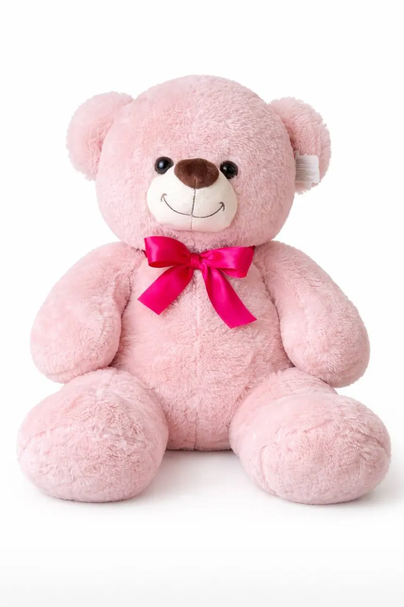 Плюшевый мишка нежно-розового оттенка с мягкой, густой и бархатистой текстурой. У него светлая мордочка, аккуратный коричневый носик и добрые блестящие глазки, а лёгкая улыбка придаёт образу особую теплоту.
