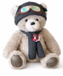 Игрушка одета в стильный зимний комплект: вязаную шапку тёмно-серого цвета с декоративными очками и уютный шарф в тон. Такой образ придаёт мишке характер и делает его особенно запоминающимся. Плотные подушечки на лапках добавляют завершённости и аккуратности внешнему виду.