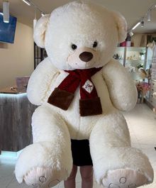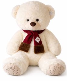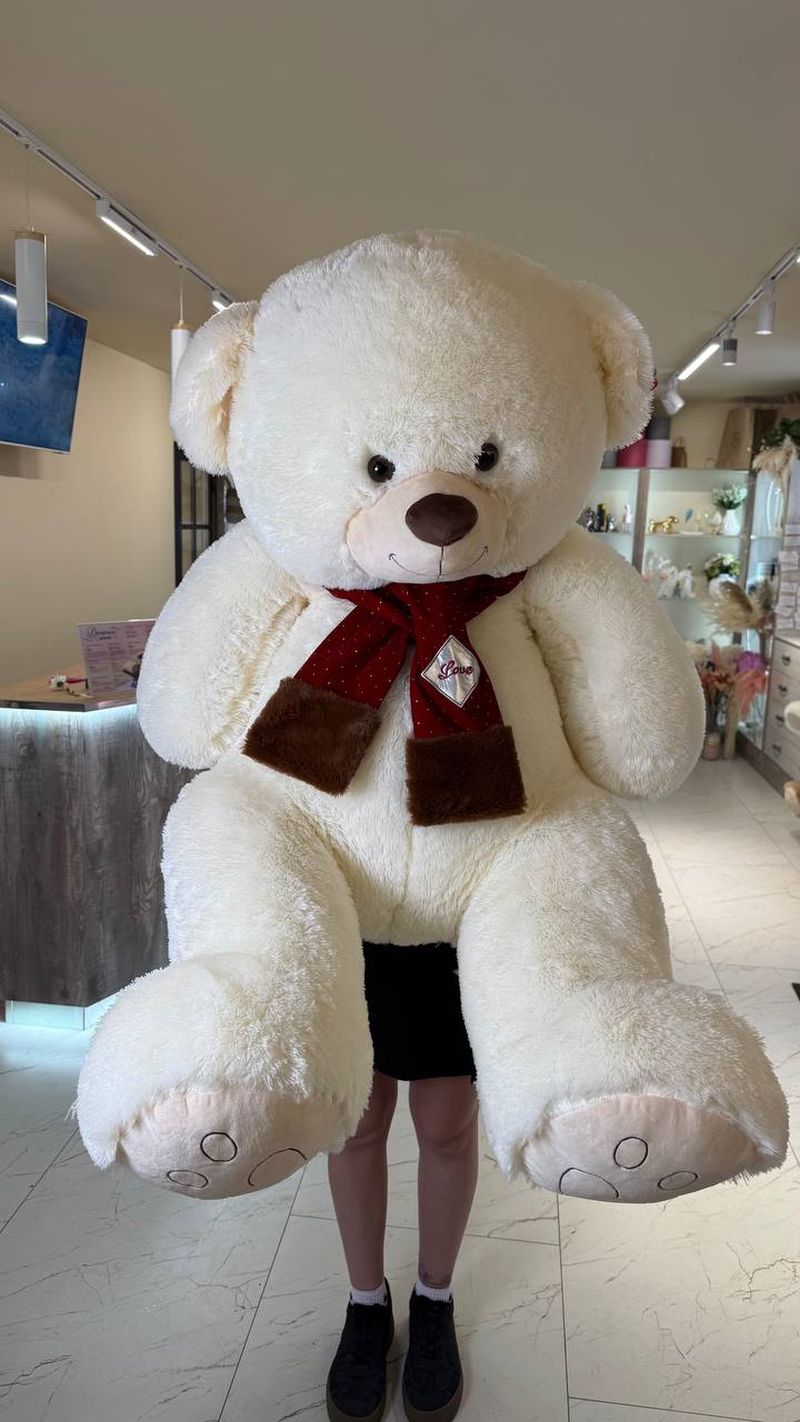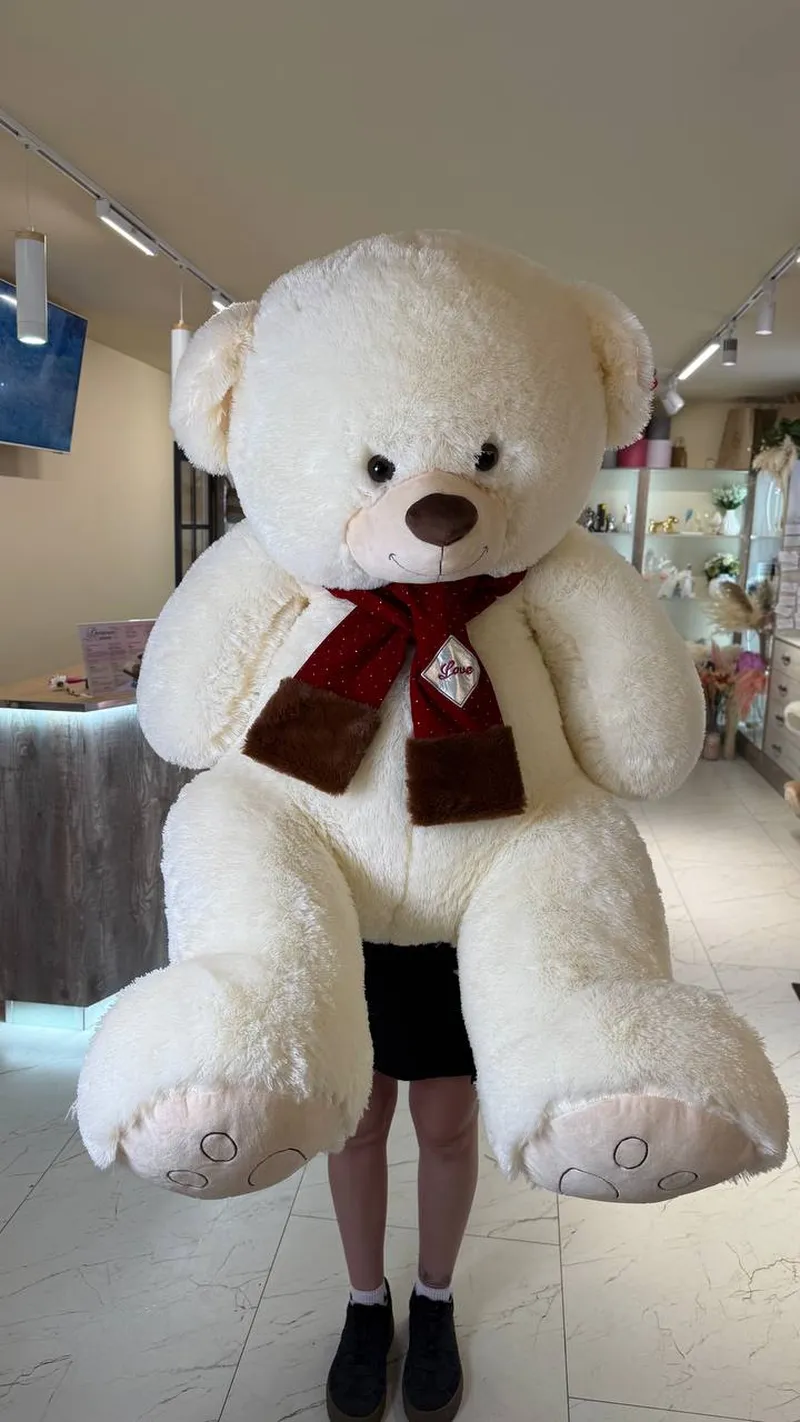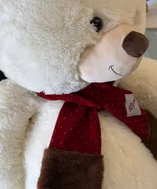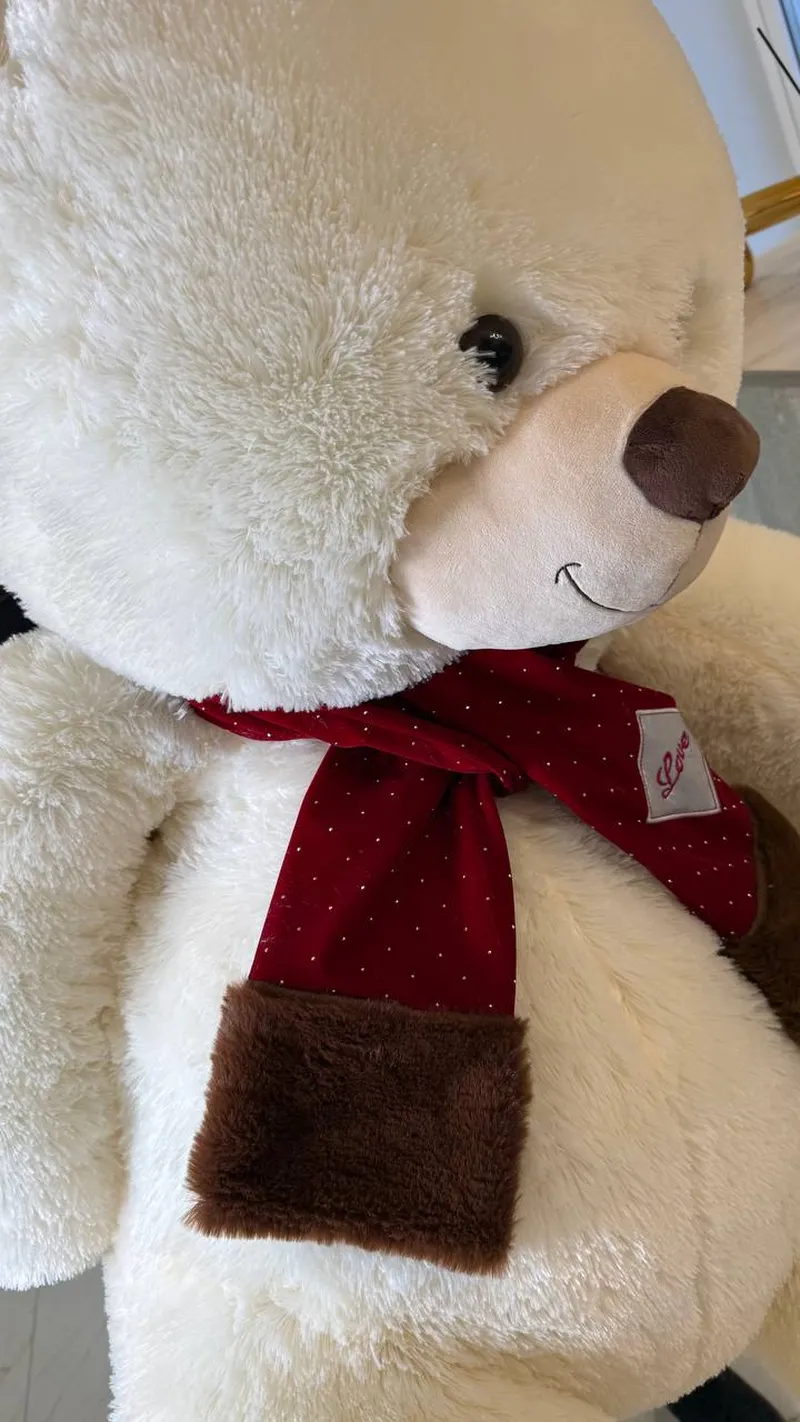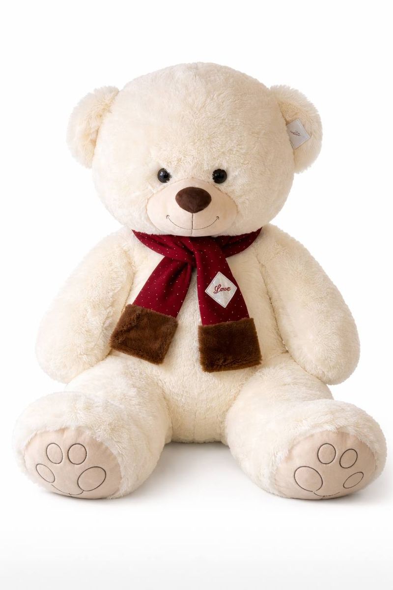 На шее — стильный красный шарфик с аккуратной нашивкой «Love» и мягкими коричневыми вставками по краям. Этот акцент добавляет игрушке романтичности и делает её особенно подходящей для подарка с тёплым посылом.