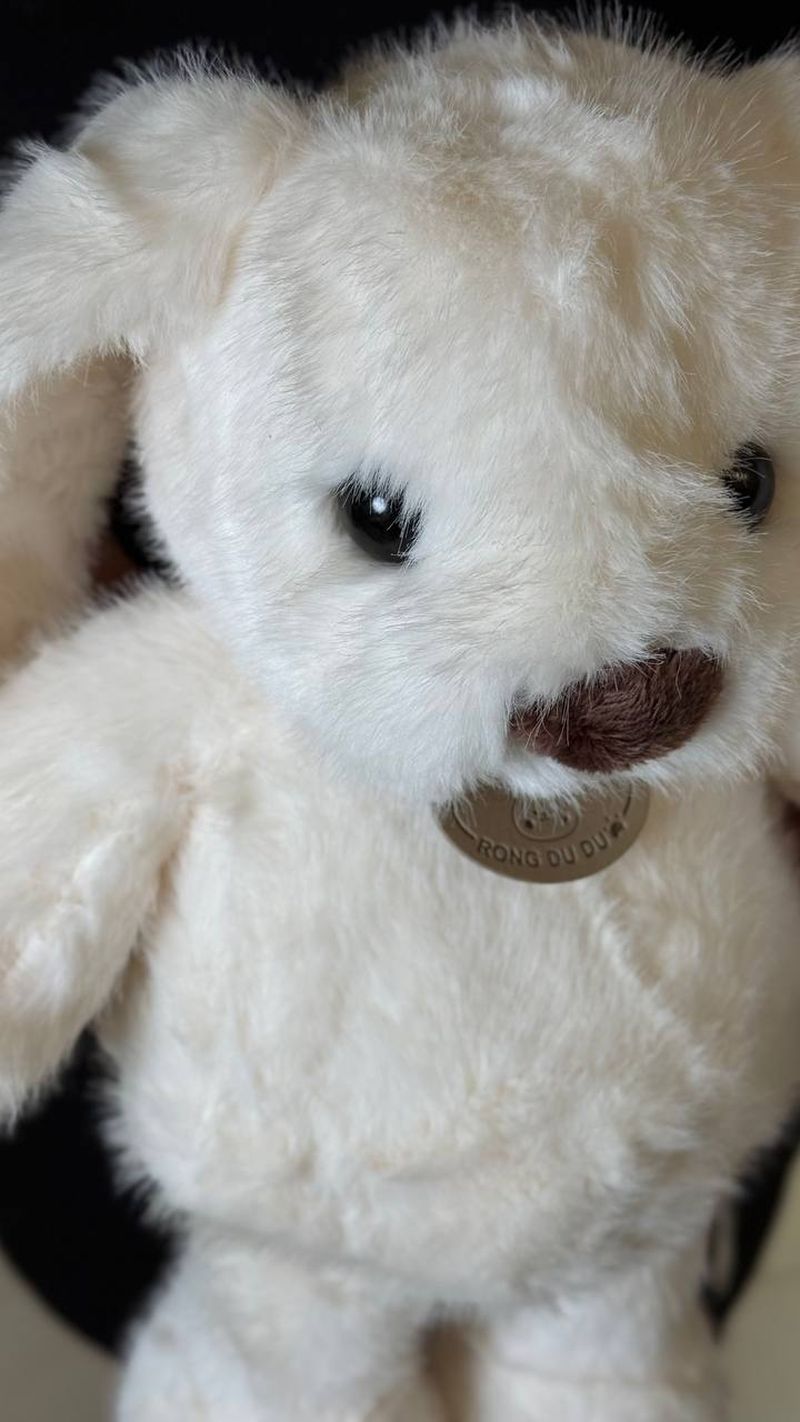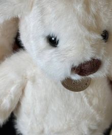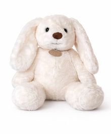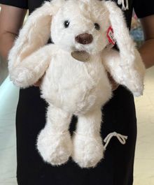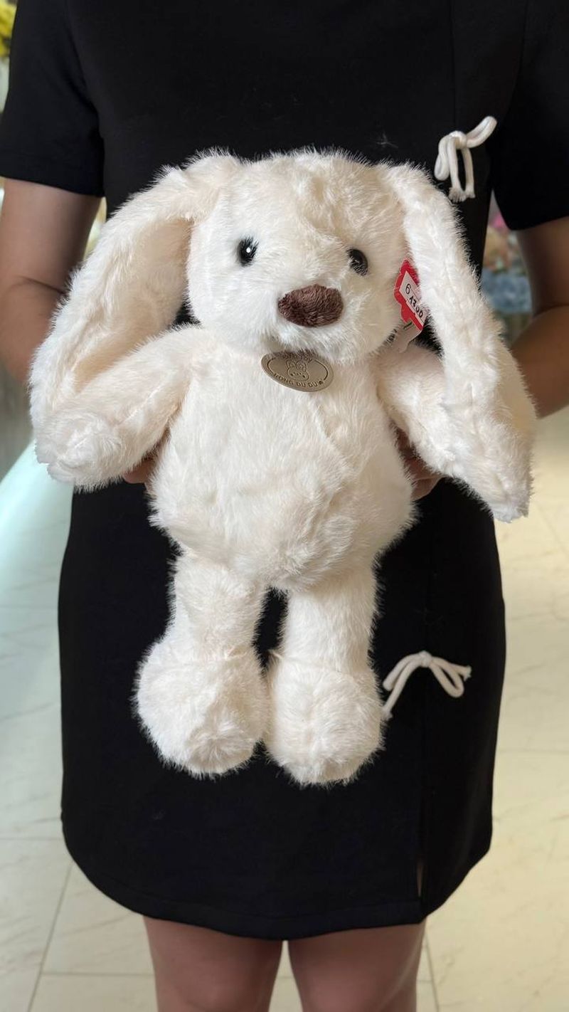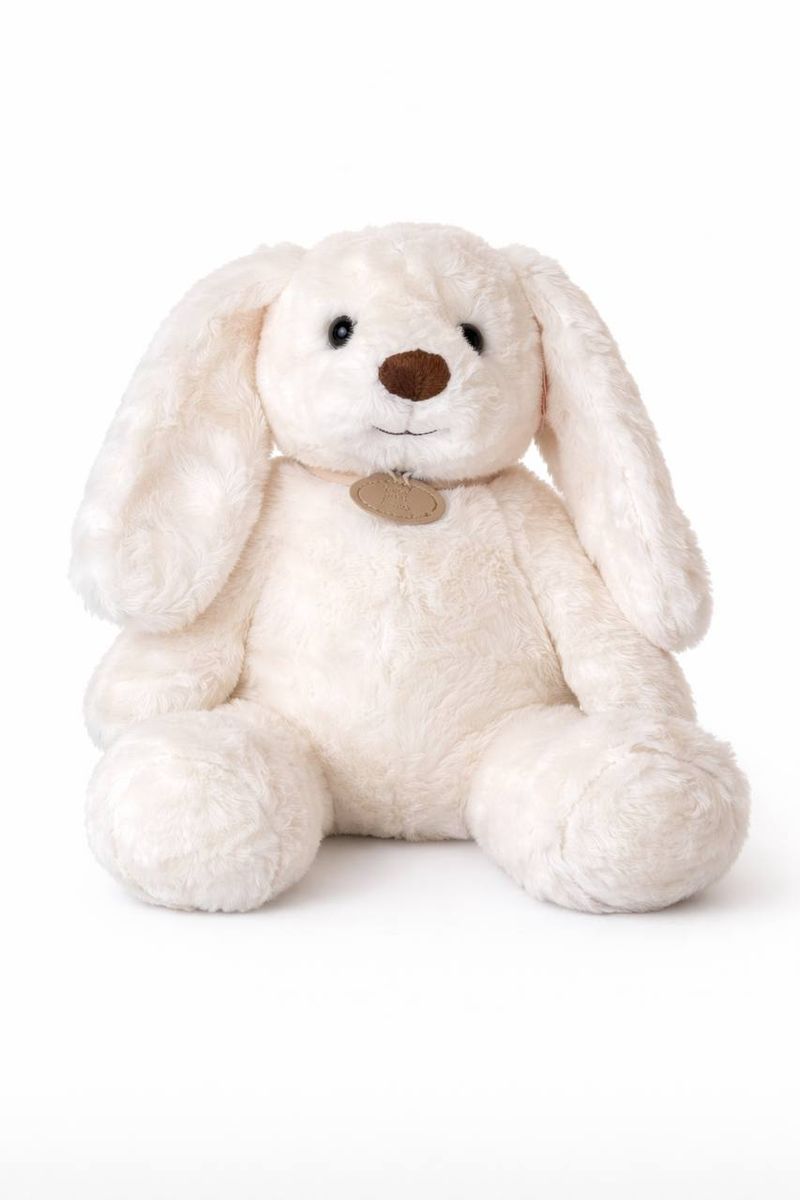 Мягкая плюшевая игрушка в виде зайчика нежного молочного оттенка. У него длинные свисающие ушки, аккуратный коричневый носик и маленькие блестящие глазки, которые придают взгляду теплоту и доброту. Зайчик сидит устойчиво, с округлыми лапками и мягким, объёмным корпусом.