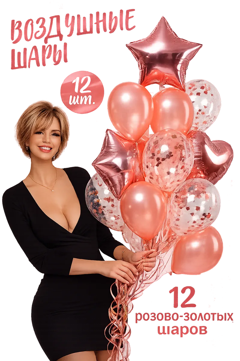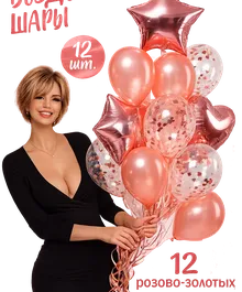 Стильный набор из 12 гелиевых шаров в нежной розово-золотой гамме — идеальное украшение для дня рождения, девичника, юбилея, выписки из роддома или романтического праздника.