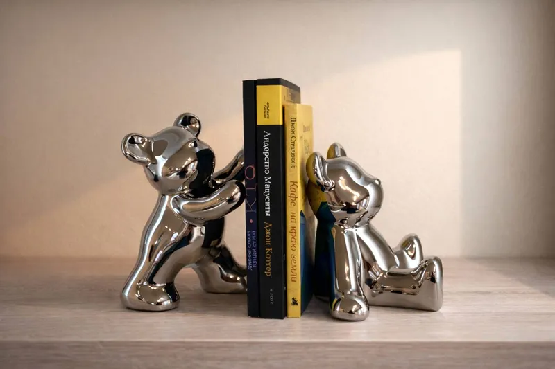 Стильные держатели для книг в виде двух зеркальных мишек, которые будто обнимают вашу коллекцию. Глянцевое хромированное покрытие создаёт эффект дорогого блеска и отражает свет, добавляя интерьеру глубины и статуса.