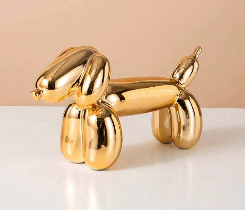 Декоративная статуэтка в форме собаки из воздушных шаров с эффектным зеркальным золотым покрытием. Глянцевая поверхность отражает свет и пространство вокруг, создавая ощущение дорогого арт-объекта из современной галереи.