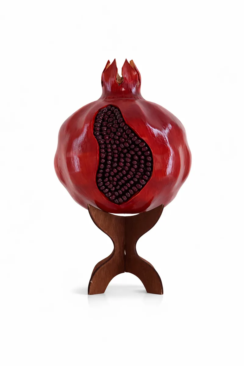 Декоративная композиция в виде раскрытого граната — мощный символ богатства, любви и жизненной энергии. Глубокий рубиновый цвет, реалистичные зёрна и благородная деревянная подставка создают эффект дорогого арт-объекта. Такой гранат не просто украшает пространство — он «работает» на атмосферу уюта и достатка.