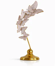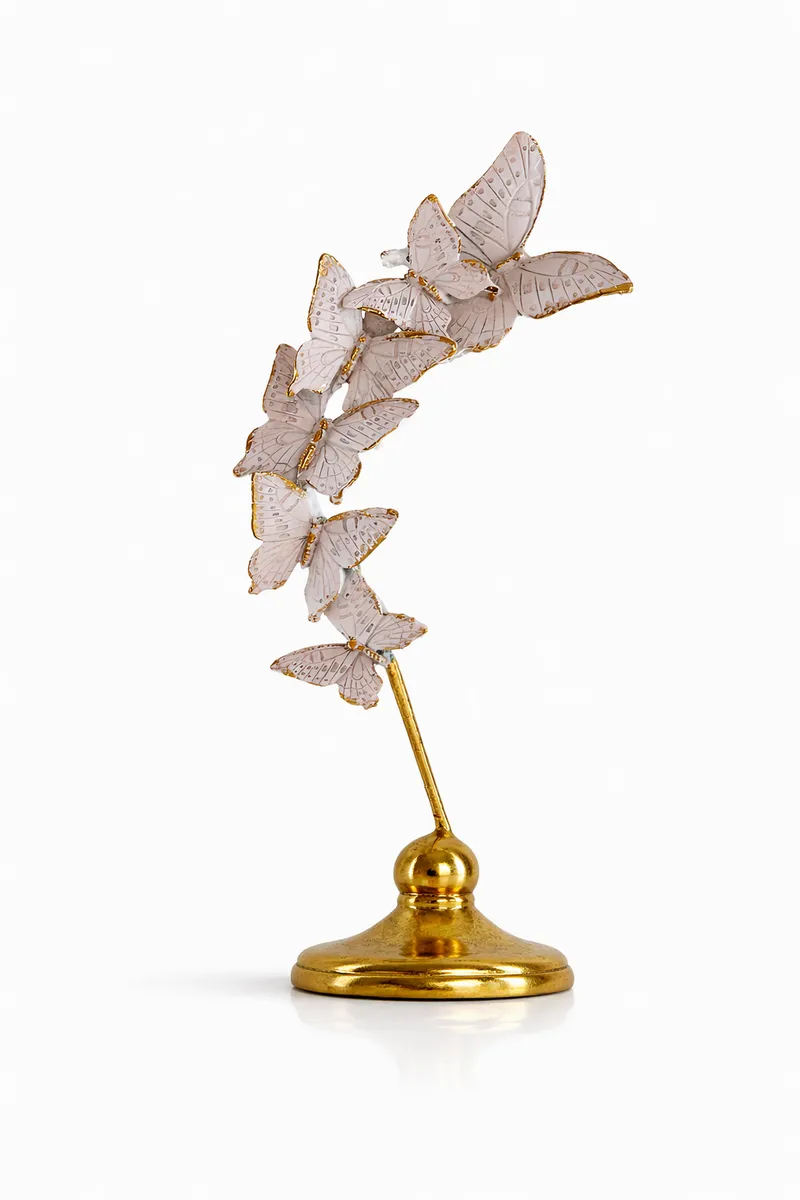 Изящная композиция из полупрозрачных бабочек с золотыми акцентами — про лёгкость, обновление и красоту момента. Тонкая линия стойки и сияющее основание делают объект воздушным, почти невесомым, но заметным в интерьере.