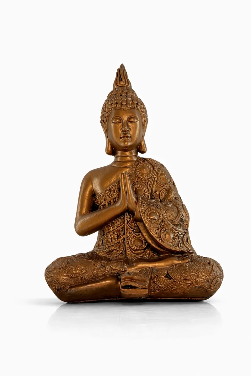 Статуэтка в тёплом золотом оттенке — про тишину, баланс и внутреннее равновесие. Детальная фактура и спокойная поза создают ощущение уюта и сосредоточенности, как будто пространство вокруг становится мягче.