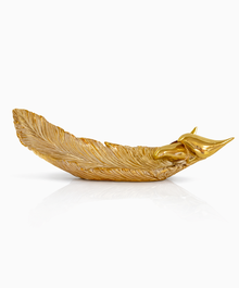 Изящное декоративное блюдо в форме пера — символ лёгкости, вдохновения и утончённого вкуса. Тёплое золотое покрытие и выразительная текстура делают предмет акцентным, но не кричащим. Смотрится как арт-объект, который хочется рассматривать.
