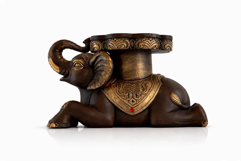 Декоративная подставка в виде слона — символ силы, защиты и процветания. Массивная форма, восточный орнамент и благородные золотые акценты создают ощущение статуса и надёжности. Слон словно «держит» благополучие дома или бизнеса, неся его на своей спине.