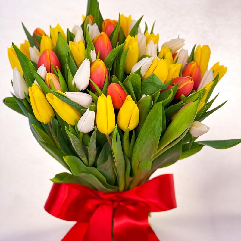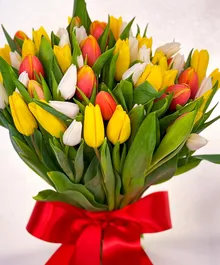 "Все краски цветущей весенней природы собран в этой яркий букет. Букет создан из свежих тюльпанов, эти цветы славятся своими нежными оттенками и тонким ароматом весны. Благодаря стойкости, букет продлит праздник на несколько дней. Преподнесите этот букет и порадуйте подарком, в каждом лепестке которого живет весна."