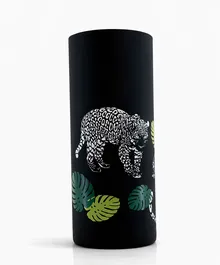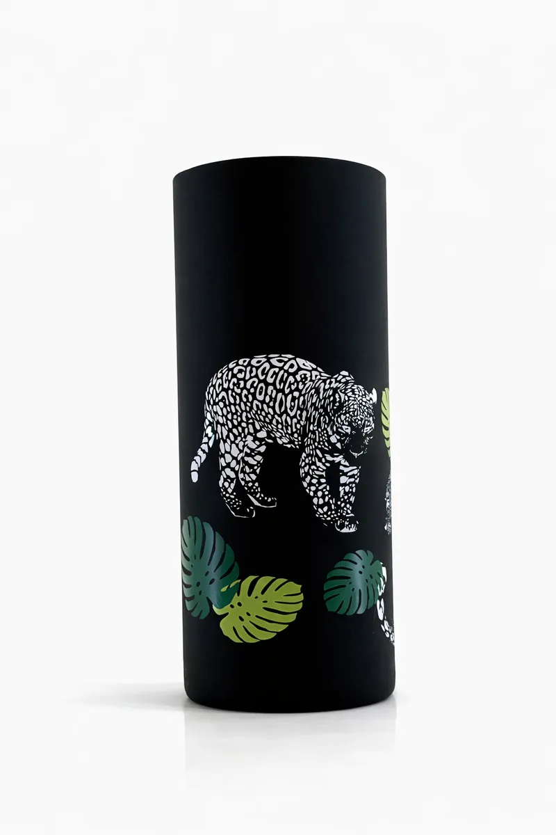 Высокая матовая ваза с графичным леопардом — смелый интерьерный акцент для тех, кто любит характер и стиль. Контраст чёрного фона, белого рисунка и зелёных листьев создаёт эффект «вау» даже без цветов.