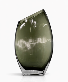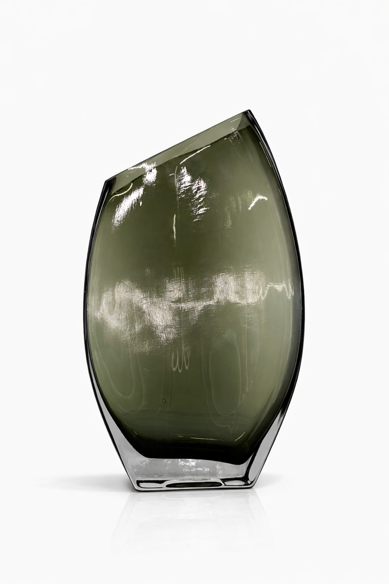 Минималистичная стеклянная ваза глубокого оливкового оттенка. Сдержанная форма, плотное стекло и благородный цвет делают её идеальным фоном для цветов — она подчёркивает букет, а не спорит с ним.