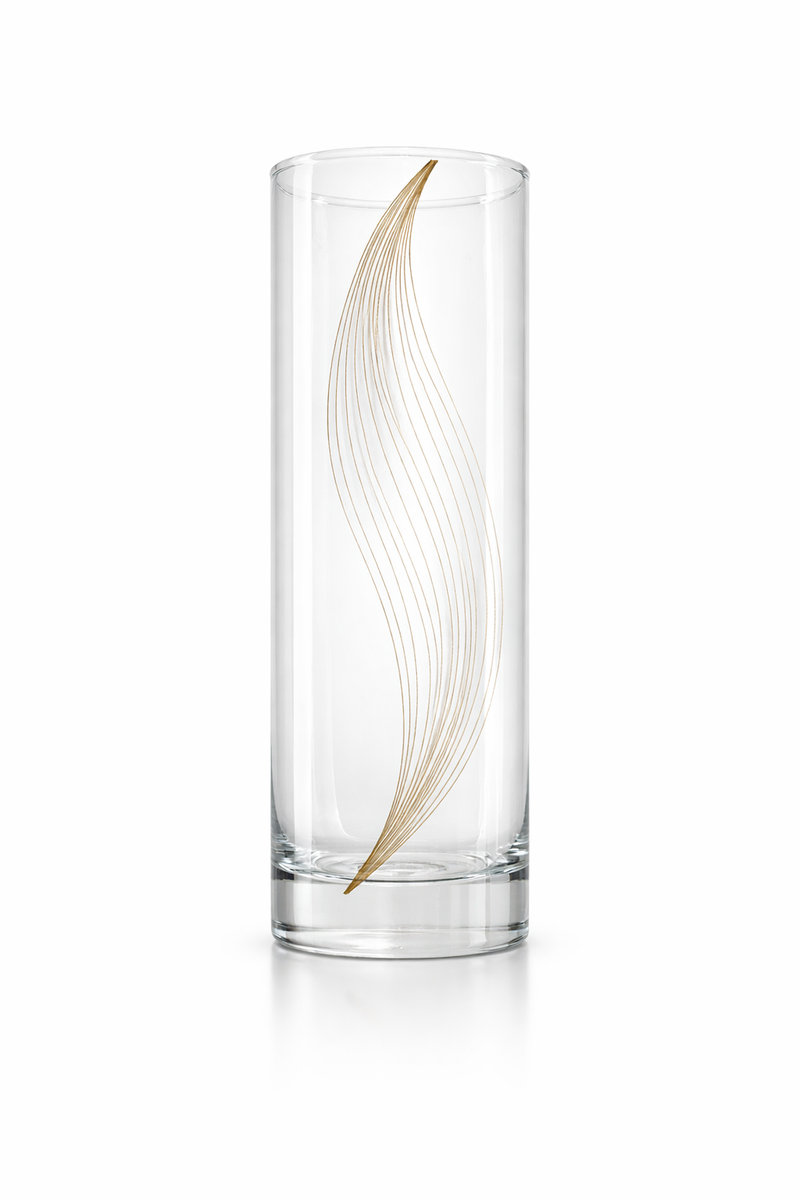 Высокая прозрачная ваза с изящной золотой линией, напоминающей плавное движение волны или лепестка. Минимализм + акцент = идеальная формула премиального декора. Золотой рисунок мягко ловит свет и создаёт ощущение ювелирной работы.