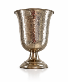 Роскошная ваза из металла с чеканной фактурой и благородным золотисто-бронзовым оттенком. Форма кубка на устойчивой ножке создаёт эффект дворцового декора и делает любую композицию центральным объектом пространства.